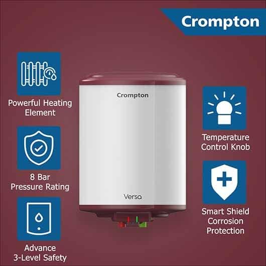 Enter a world of utmost comfort with the Crompton Versa Water Heater. with just a simple twist of a knob, you get the exact water temperature you want. No waiting, just pure instant comfort. Its tank has a special glassline coating which makes this water heater last for years by keeping rust and corrosion away. You will never have to wait long for your water to heat up because its powerful heating mechanism gives you quick and reliable hot water any time, saving you time when you need it most. And while you are enjoying your warm shower, the water heater’s advanced 3 level safety features quietly keeps everything in check, making sure you are always protected. The Crompton Versa Water Heater gives you the peace of mind and comfort you deserve every day.