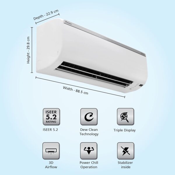 • Special Features: Triple Display (Power consumption %age, Set/Room Temperature & Auto error code); Dew clean technology that cleans indoor unit coil with a press of button