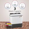 • Wash Programs: 03 No. of Programs- Gentle: used to wash delicate and less soiled cloths, so that there is no damage to cloth fabric | Normal: used to wash soiled, dirty and sweaty cottons and linen fabrics | Strong: used to wash heavily soiled & dirty clothes, including jeans fabric etc. | Panel- Water Selector, Wash Timer, Wash Selector, Drain Selector, Spin Timer