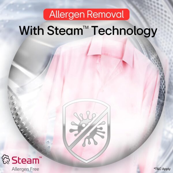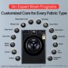 • Wash Programs: 14+ No. of Programs – Cotton; Cotton+; Mixed Fabric; Easy Care; Silent Wash; Allergy Care; Baby Steam Care; Delicate; Hand/Wool; Sports Wear; Quick 30; Duvet; Tub Clean; Download Cycle: can download additional wash programs using LG ThinQ app | Display Type – Dial + Full Touch Buttons & LED Display; Water proof Panel