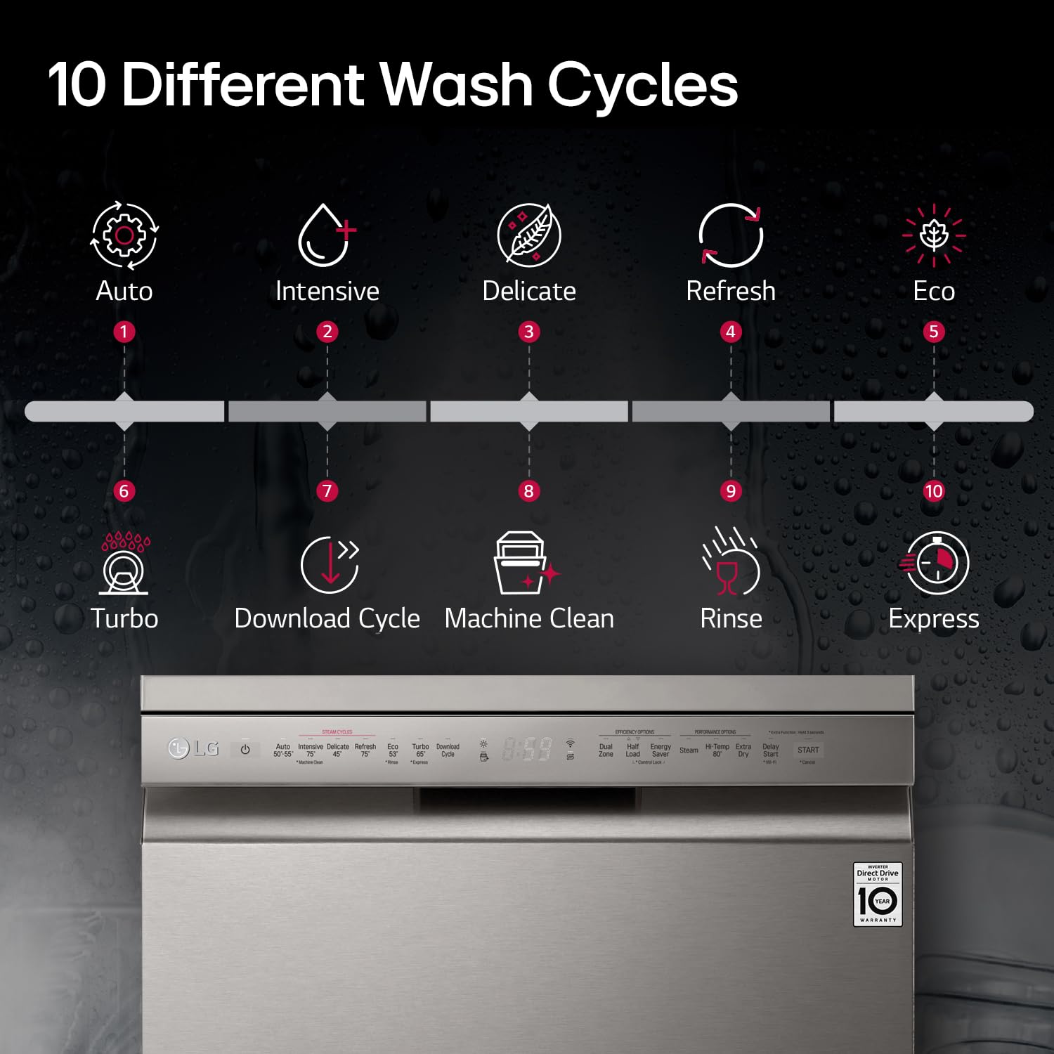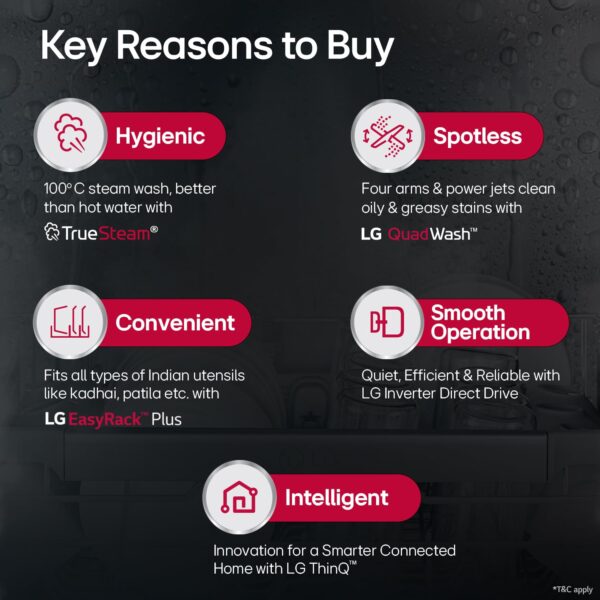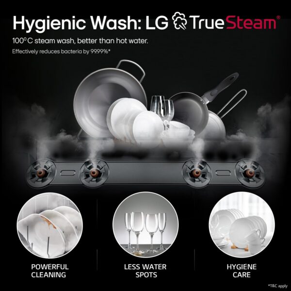 Presenting you the LG DFB424FP Dishwasher that features True Steam which is made by boiling water that reaches the entire surface of every dish inside the tub resulting in sparkling clean dishes. Pure water particles of steam also help reduce water spots. It is energy efficient as well. Offers dual zone wash. It has Smart Diagnosis feature as well. Equipped with Four washing arms.