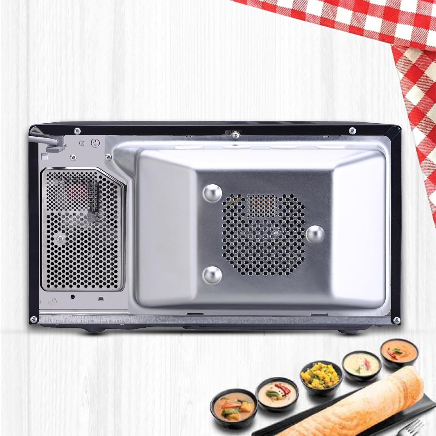 • Additional Features: Timed Cook, defrost, programmable, timer, turntable, Keep Warm, Energy Saving, Dehumidification – for soggy foods like biscuits, chips and namkeens, etc. can be made fresh and crisp