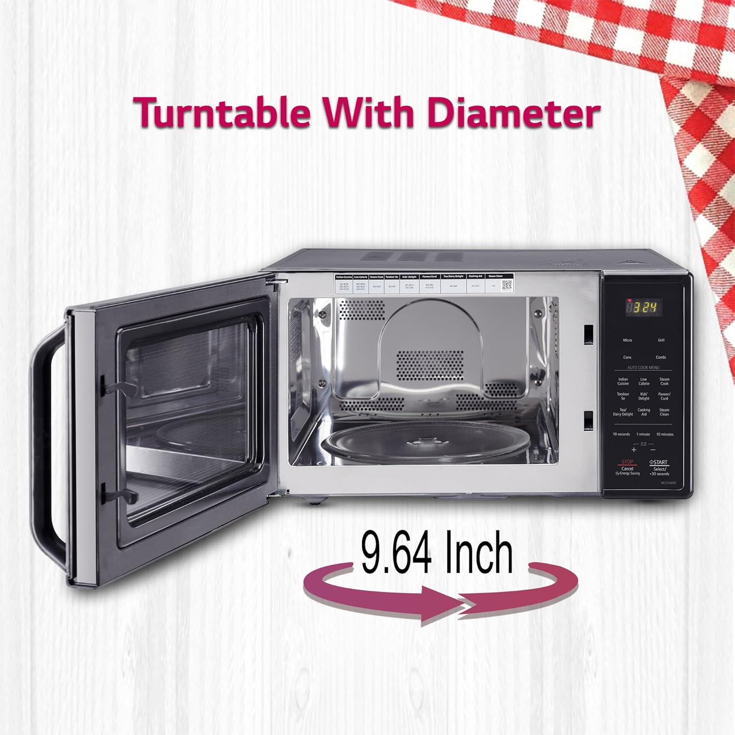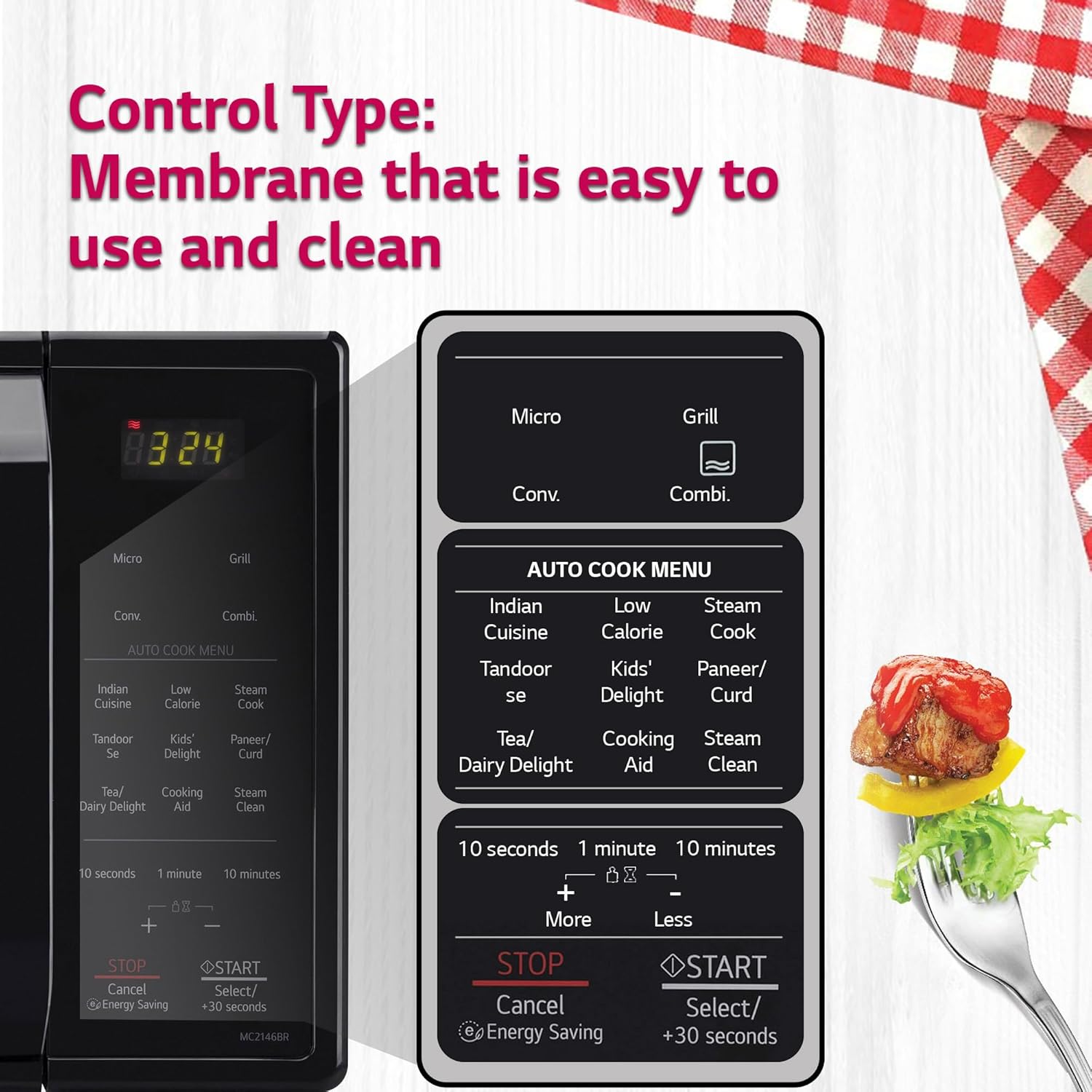 • Panel information in detail / Baking functions / Programs: Micro, Grill, Convection, Combination | Indian Cuisine, Tandoor se, Tea / Dairy Delight, Cooking, Low Calorie, Kids Delight, Cooking Aid, Steam Cook, Paneer / Curd, Steam Clean | Stop / Clear, Start