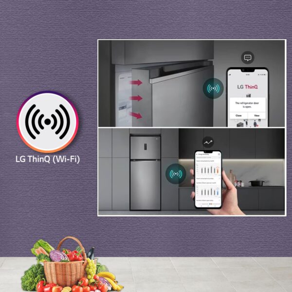 You can store a variety of foods and beverages in one place and keep them fresh for long periods with the LG GL-T342TPZY 322 L Frost-free Double-door Refrigerator. It is equipped with LG ThinQ technology, enabling you to remotely control its settings using any Wi-Fi-enabled device, regardless of your location. In addition, this refrigerator features Hygiene Fresh+ technology, which effectively removes odour and eliminates almost all bacteria, making it easy to keep clean. Moreover, this refrigerator comes with Door Cooling+ technology, which ensures rapid and efficient cooling performance for all compartments.