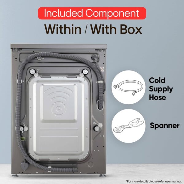 | Included Components | 1U Front Load Fully-Automatic Washing Machine; Cold Supply Hose, Anti-slip sheets, Spanner, Elbow bracket for securing drain hose,, Brand warranty can be availed using amazon invoice and user manual can be accessed from brand website, Caps for covering transit bolt holes, Tie Strap (Accessories are subject to availability), Power Cord |