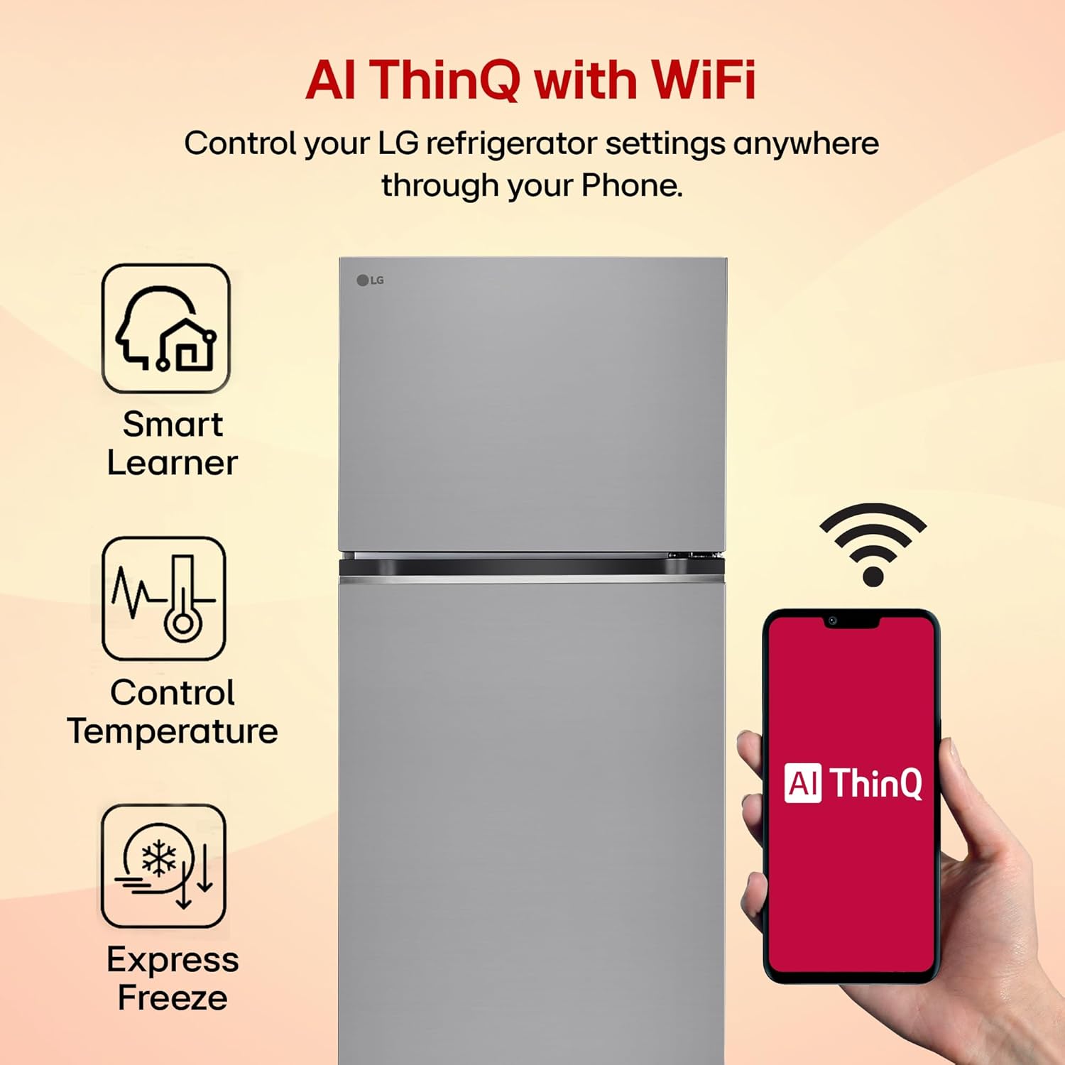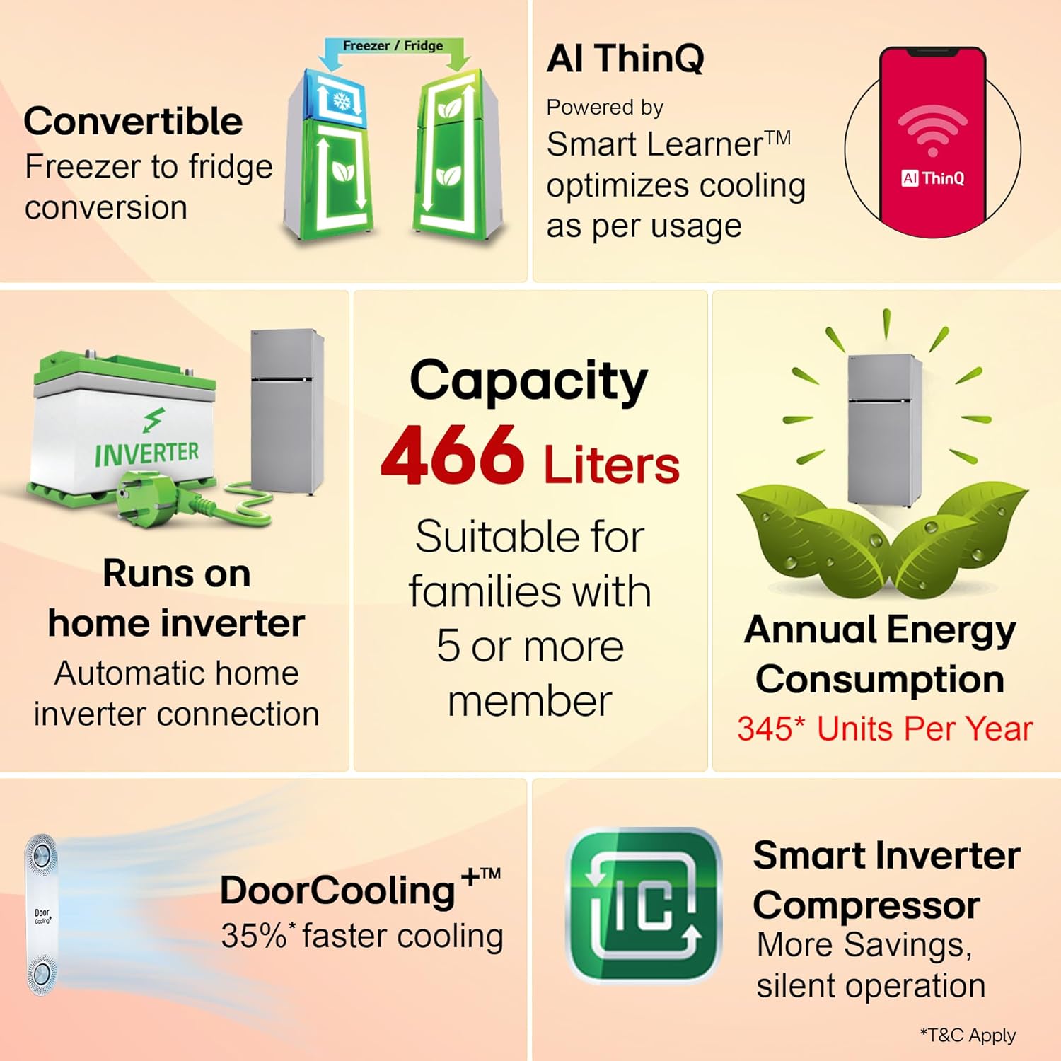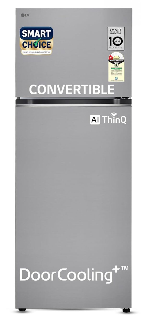 • Key Features: Convertible – Freezer to fridge conversion, offers you more space to suit your needs; Door Cooling+ – 35% faster cooling; Temperature Control – I Micom Tact; Express Freeze – for preserving food quality and nutrients, and it also helps achieve desired freezing temperatures; AI ThinQ – Optimizes cooling as per usage; Wi-Fi – Control your refrigerator remotely; Smart Diagnosis – Detects problems automatically; Deodorizer – free from unpleasant smells; Anti-Bacteria Gasket for hygiene and food freshness; Works Without Stabilizer (100 ~ 310V)