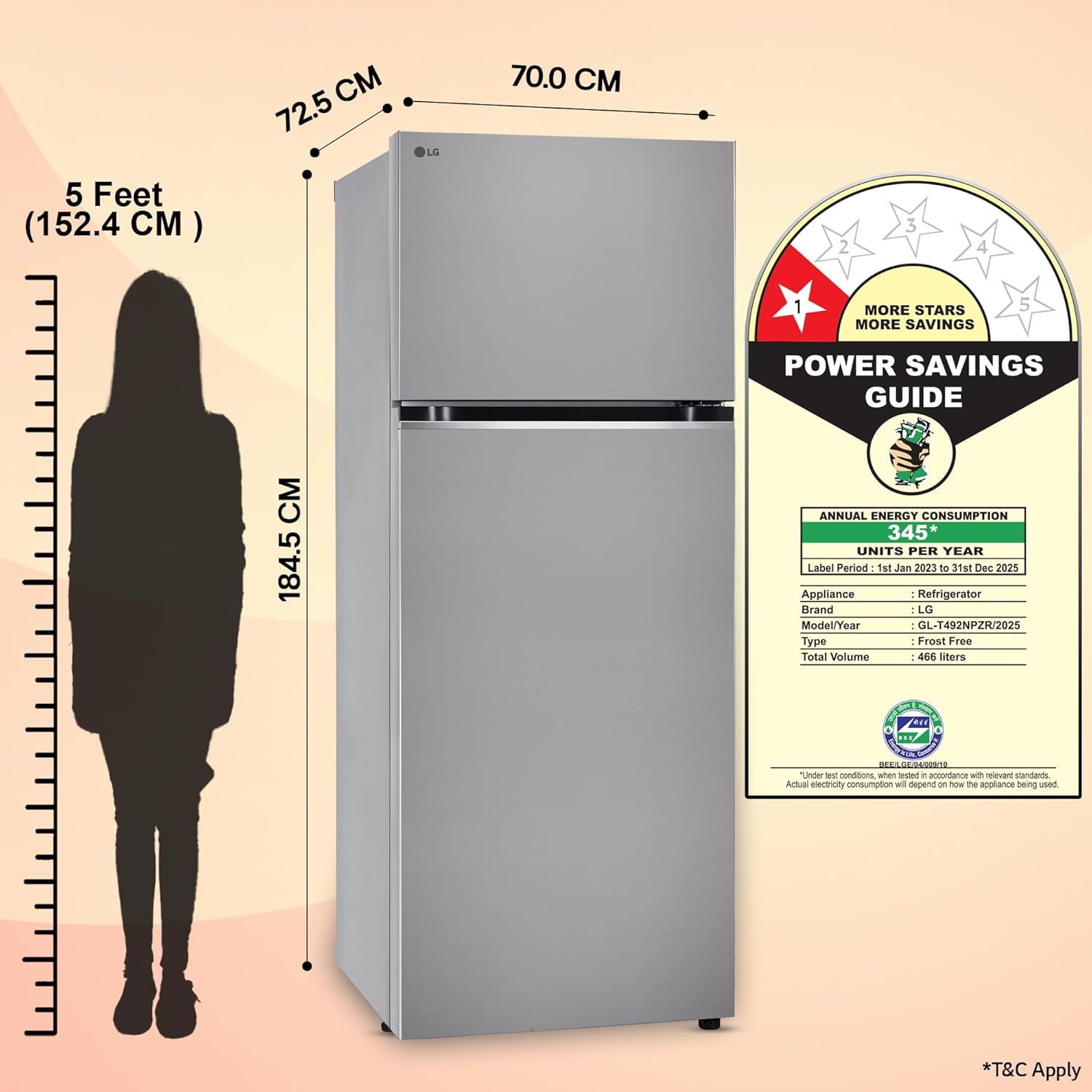 LG Smart Choice, 466 L, 1 Star, Convertible, Door Cooling+, Smart Inverter Compressor, AI ThinQ Wi-Fi, Frost Free Double Door Refrigerator (GL-T492NPZR, Shiny Steel, Express Freeze & Multi Air Flow)