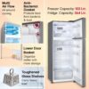 • Storage or Interior description: Total no: of – Compartments: 2 (Fridge & Freezer); Egg tray; Vegetable drawer – keep fruits and vegetables fresh for longer; Ice Maker – Movable, Single Twist (12 Ice cubes /tray); Chiller – Fresh O Zone – save defrosting time; Shelf (Nos.) – 3 (Trim less tempered Glass); Door Basket; Pocket Handle; 2 ltr. bottle storage