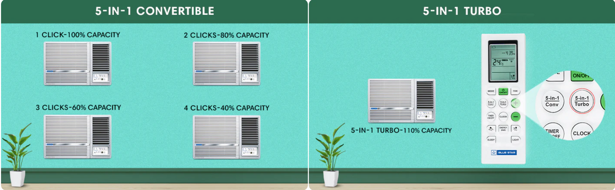 The Blue Star WIE518L 1.5 Ton 5 Star Inverter Window Air Conditioner delivers powerful cooling with superior energy efficiency, making it an ideal choice for medium to large-sized rooms. Powered by an advanced inverter compressor, this AC intelligently adjusts its speed based on cooling demand, ensuring consistent comfort while significantly reducing electricity consumption. The Turbo Cool mode provides instant cooling during extreme summer heat, while the compact window design offers easy installation without the need for an outdoor unit.