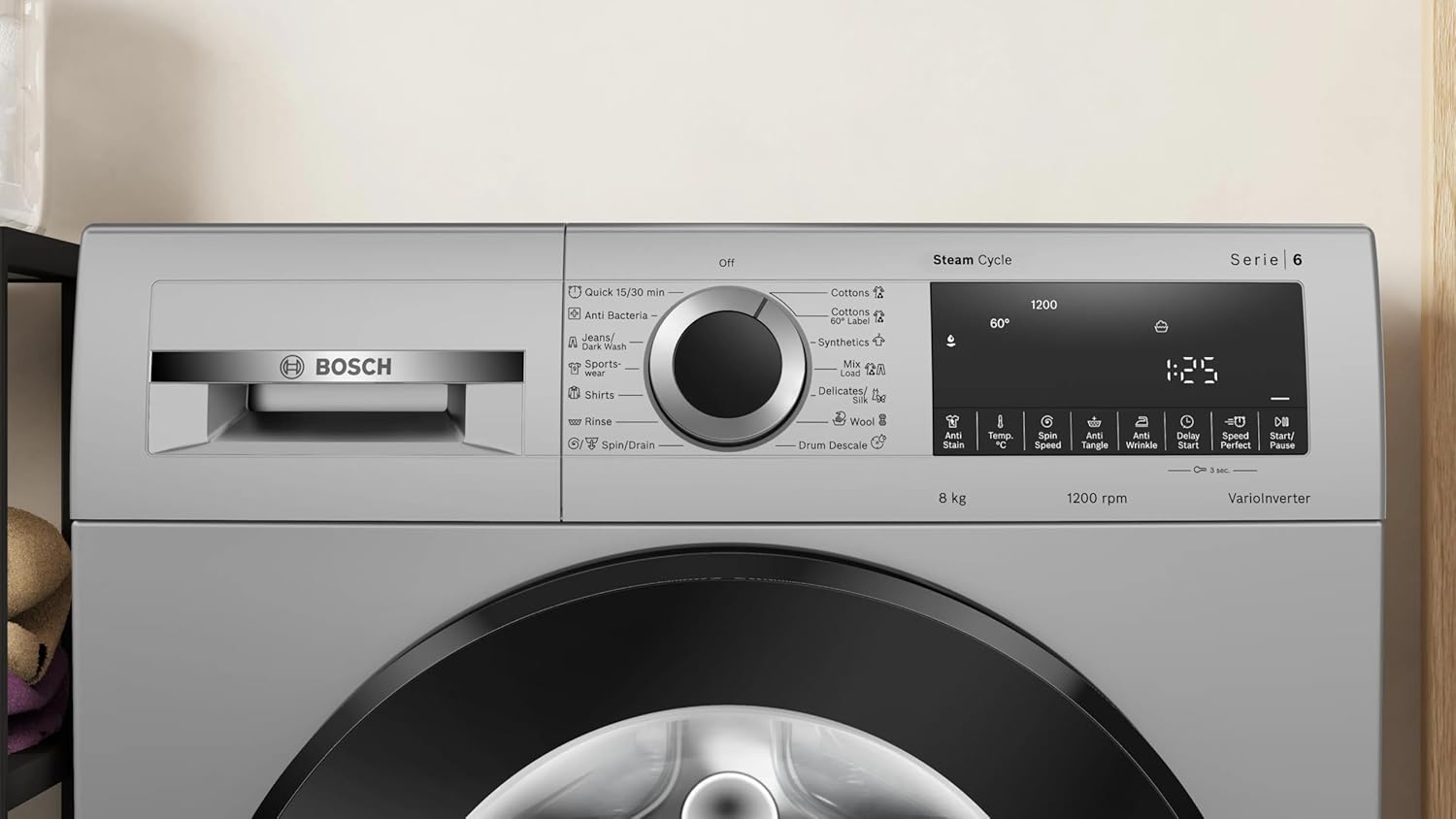 Equipped with Touch Controls and multiple wash cycle options including Extra Rinse, this washing machine provides enhanced customization for different fabric types and washing needs. The powerful 1200 RPM spin speed ensures faster drying by effectively removing excess water from clothes. Built with Bosch’s trusted engineering and backed by a 3-year warranty, this appliance combines durability, performance, and style in a sleek grey finish.