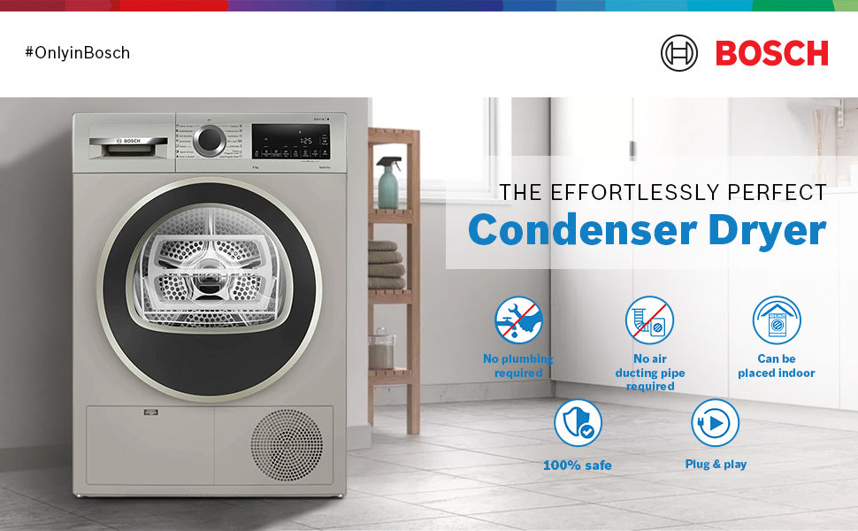 The Bosch 9 Kg Fully Automatic Front Load Condenser Tumble Dryer (WPG24108IN, Silver) is a dedicated, high-performance dryer designed to deliver 100% effective drying with exceptional fabric care. Ideal for large families, this dryer features a spacious 9 kg capacity and advanced condenser drying technology, making it suitable for all fabric types including cotton, wool, silk, delicates, and sportswear. Clothes come out ready to wear, reducing the need for additional ironing.