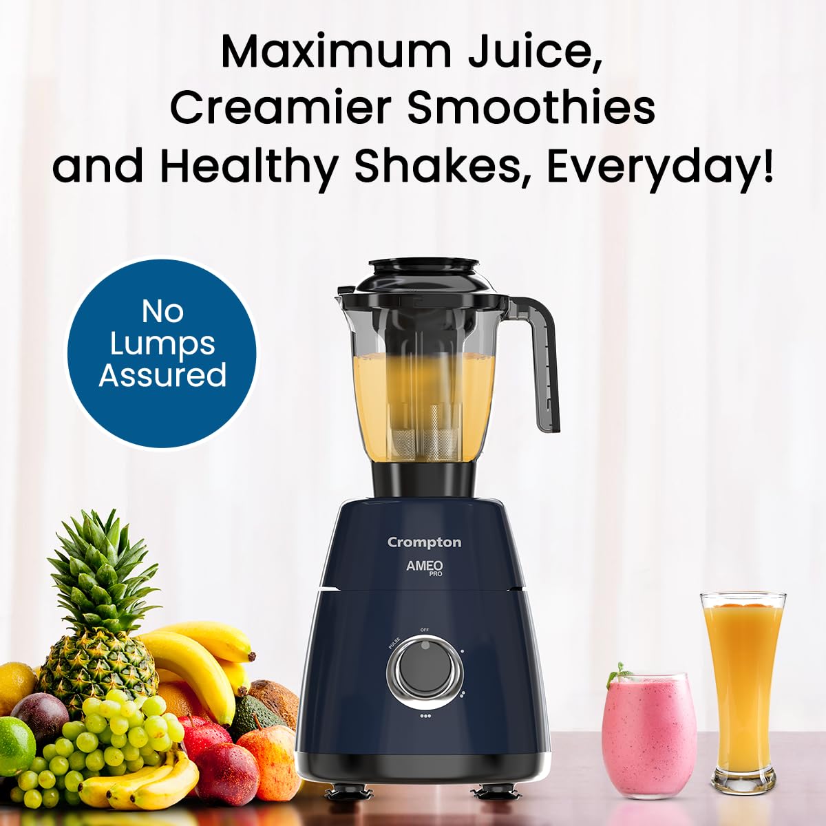 Designed for durability and long-lasting performance, the Ameo Pro features Motor Vent-X Technology, which enhances airflow to keep the motor cool during extended usage. It comes with 3 stainless steel jars and 1 juicer jar, offering flexibility for grinding, blending, and juicing. With 3-speed knob control, sharp stainless steel blades, and a stylish black & blue finish, this mixer grinder combines power, convenience, and Crompton’s trusted reliability for everyday cooking needs.
