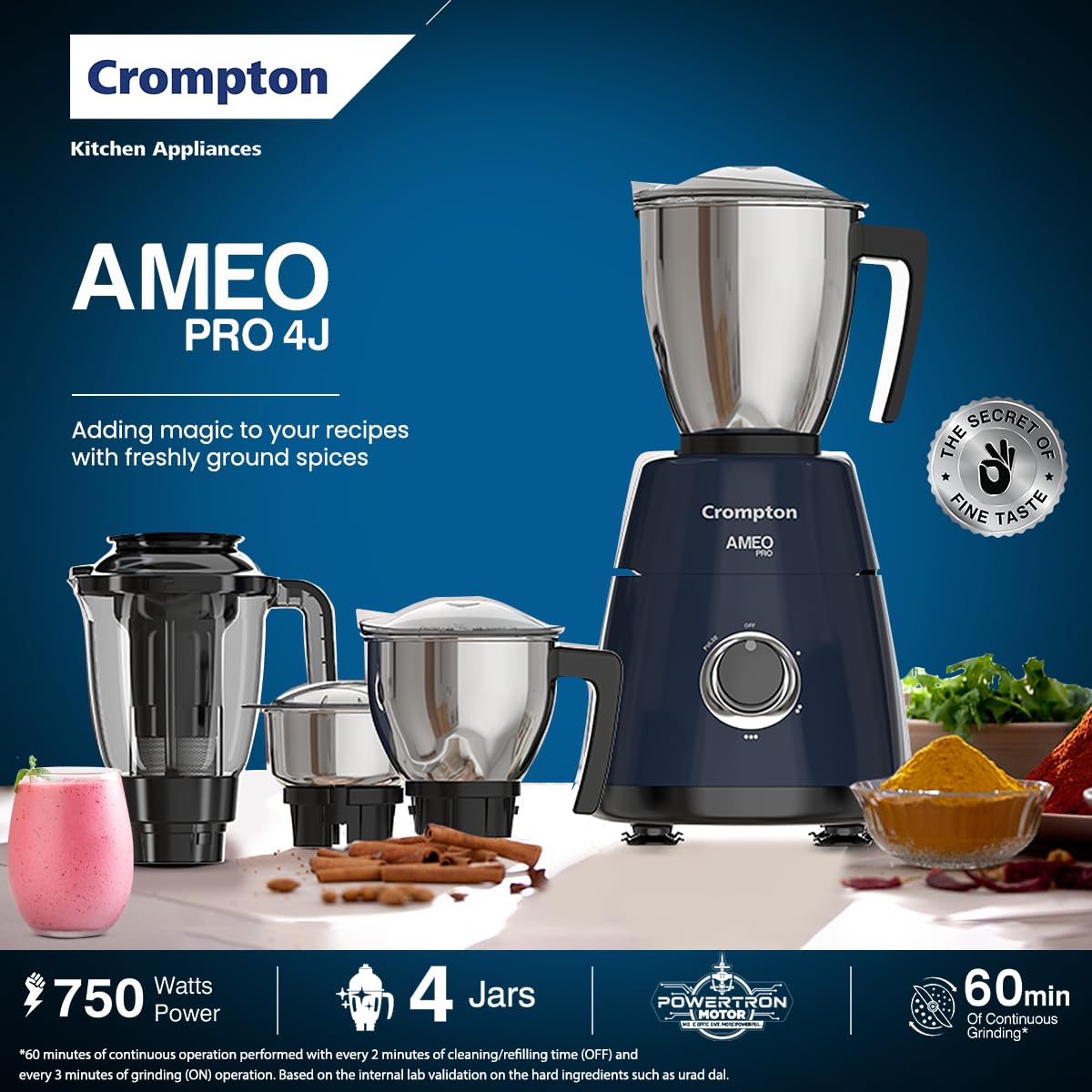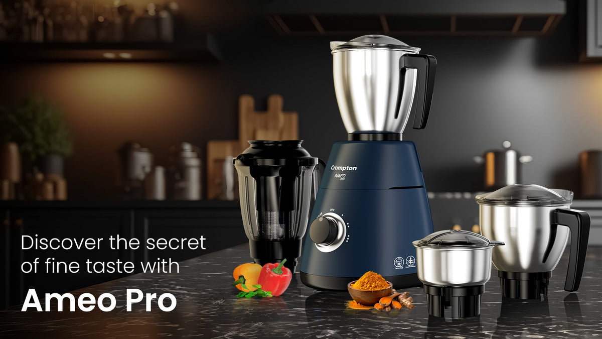 The Crompton Ameo Pro 750W Mixer Grinder (4-Jar) is built for high-performance grinding and versatile food preparation in Indian households. Powered by a robust 750-watt motor, it effortlessly handles tough ingredients such as dry spices, wet masalas, batters, and chutneys. The advanced MaxiGrind Technology delivers faster and finer grinding, helping you achieve consistent textures with ease, while its compact footprint makes it suitable for modern kitchens.