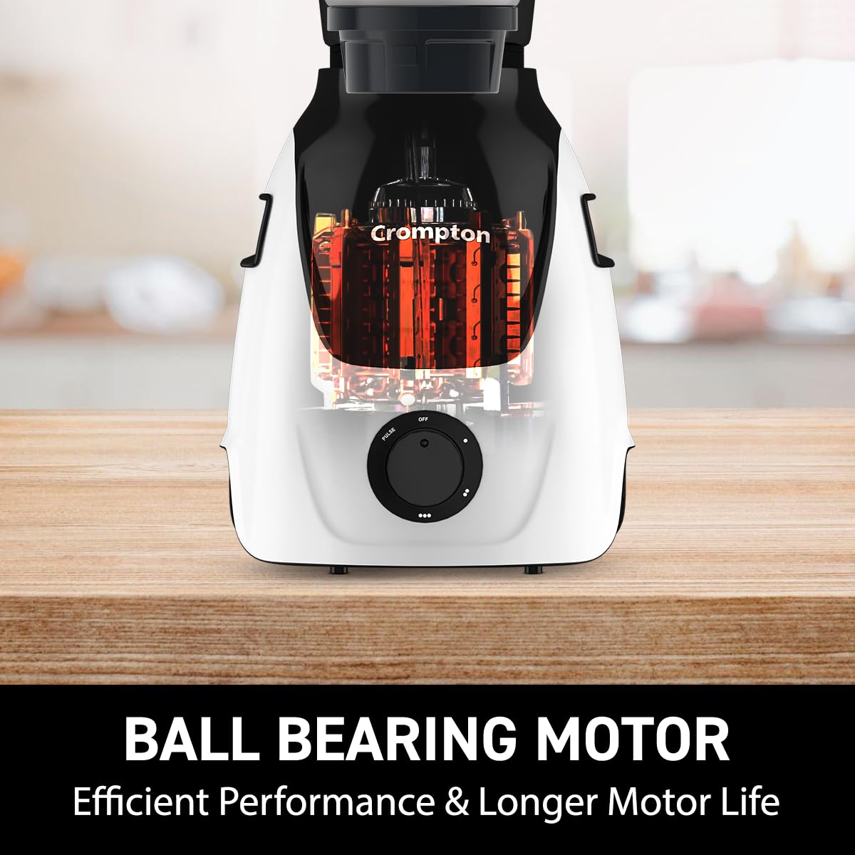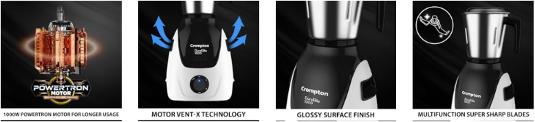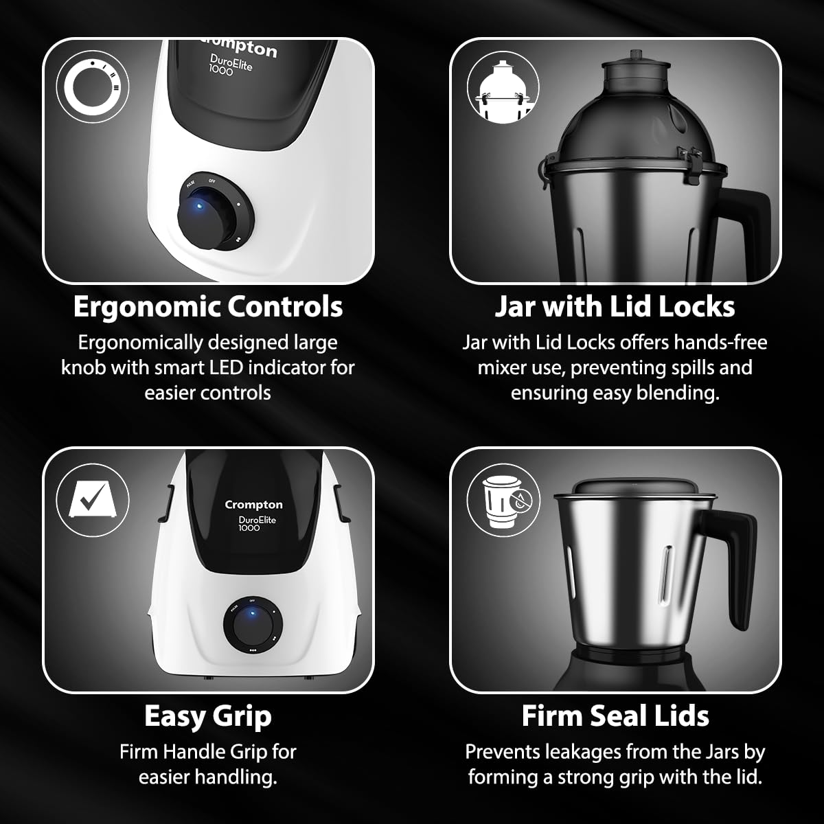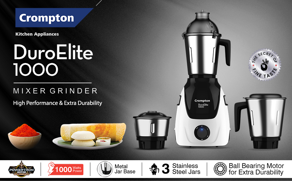 The Crompton Duroelite 1000-Watt Mixer Grinder is built for heavy-duty grinding and high-performance cooking in Indian kitchens. Powered by a robust 100% copper motor with ball bearing technology, it delivers superior torque, smoother operation, and long-lasting durability. With its powerful 1000W motor, this mixer grinder effortlessly handles tough ingredients such as turmeric, dry spices, wet masalas, and thick batters, making it ideal for large families and frequent usage.
