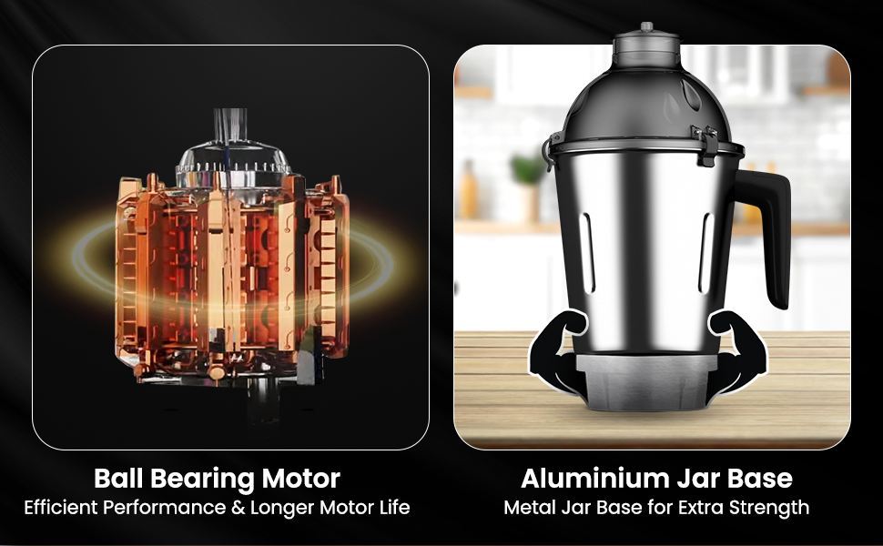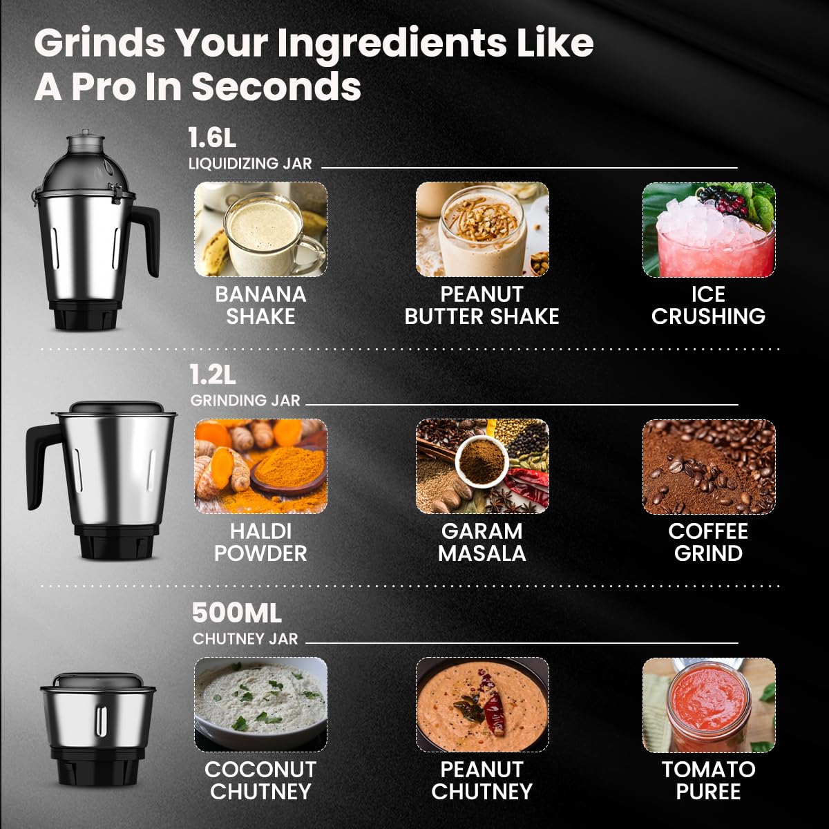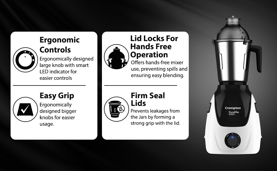 Designed with strength and safety in mind, the Duroelite features a metal jar base for added durability and stability during operation. The lid lock design ensures safe grinding, while the LED speed indicator provides clear visibility of speed settings. Equipped with 3 stainless steel jars, adjustable speed control, and a sturdy ABS plastic body with stainless steel components, this mixer grinder combines power, reliability, and modern design, backed by Crompton’s trusted quality and extended warranty.