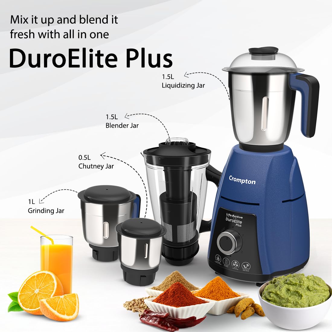 Crompton DuroElite Plus 800 W Mixer grinder with 4 Jars (3 stainless steel Jars+ 1.5L Juicer Jar with Fruit Filter)| Heavy Duty Powertron Motor & Motor Vent-X Technology |Blue