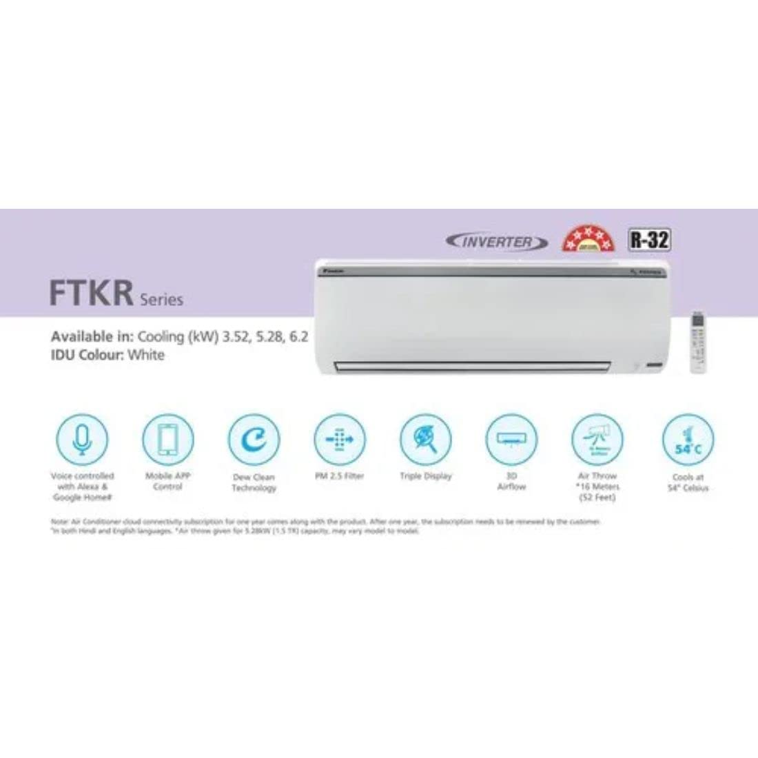 The Daikin FTKR50UV16U 1.5 Ton 5 Star WiFi (IoT) Enabled Inverter Split Air Conditioner is engineered to deliver superior cooling performance, intelligent energy efficiency, and advanced air purification. With a powerful 18,000 BTU cooling capacity and an impressive 5.2 ISEER rating, this AC ensures maximum cooling even at extreme temperatures up to 54°C, maintaining 100% cooling capacity at 46°C. Its annual power consumption of just 785.67 kWh makes it an excellent choice for energy-conscious households.
