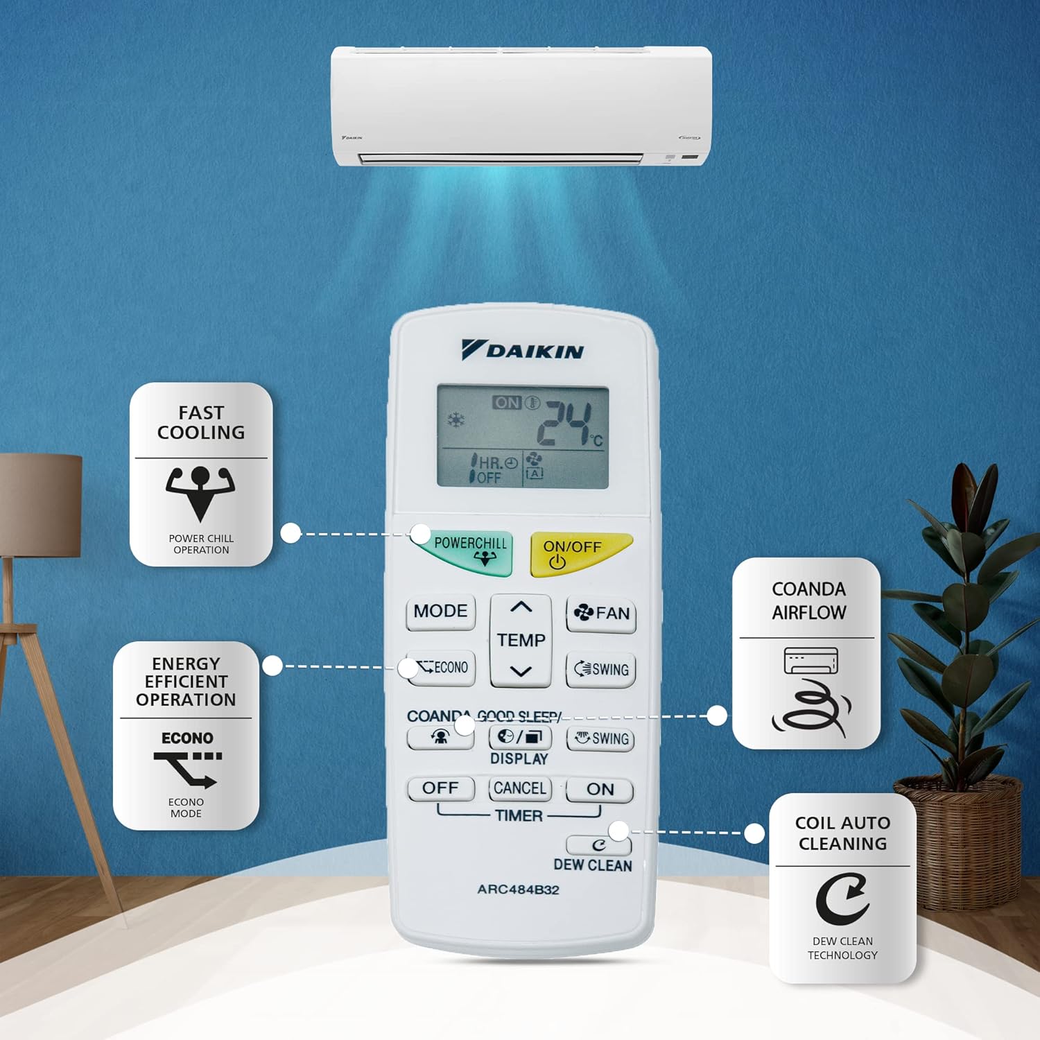 Equipped with a copper condenser coil with anti-corrosion treatment, this AC ensures better heat transfer, durability, and low maintenance. Features like Titanium Apatite anti-bacterial filter, 3D airflow, Dew Clean Technology, and high ambient operation up to 52°C enhance comfort, air quality, and hygiene. The triple display provides clear operating information, while Daikin’s strong warranty support—1 year on product, 5 years on PCB, and 10 years on compressor—offers long-term peace of mind.
