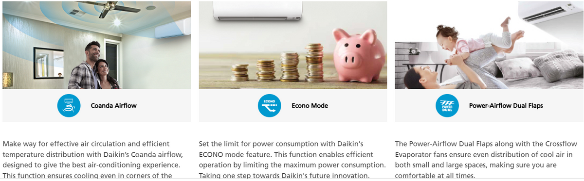 Designed for everyday comfort, this AC features Sleep Mode, which automatically adjusts temperature during the night for a comfortable sleeping experience. The Auto Restart function restores previous settings after a power cut, ensuring uninterrupted cooling. Backed by Daikin’s trusted engineering and robust build quality, this split AC delivers consistent cooling, energy efficiency, and dependable performance.