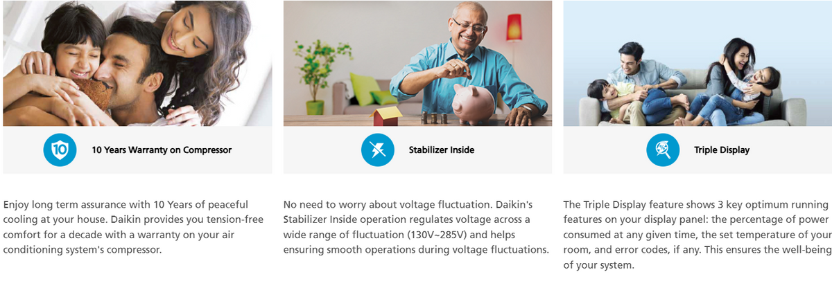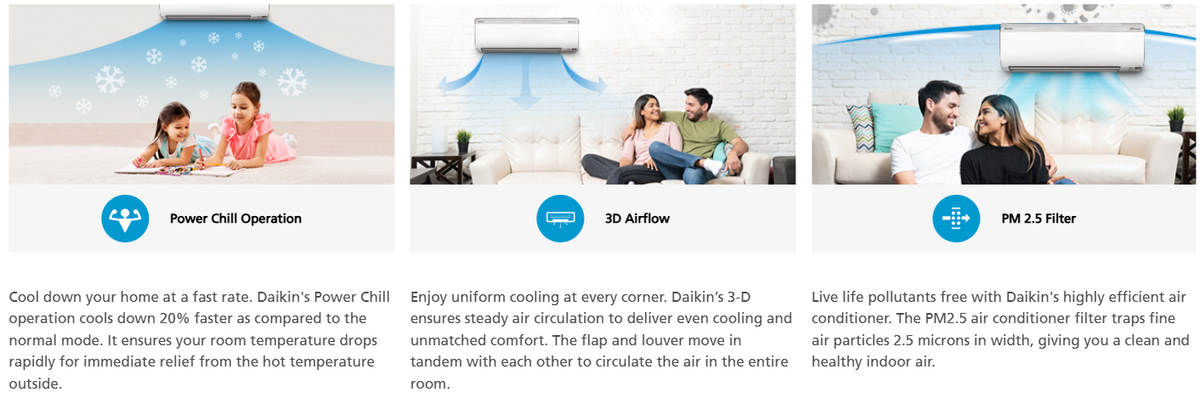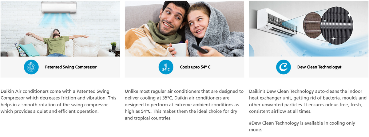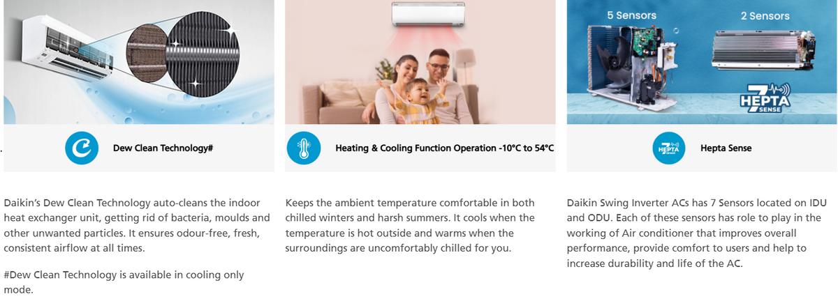 Equipped with Hepta Sensa technology (7 intelligent sensors), this AC continuously monitors indoor and outdoor conditions to optimize cooling, airflow, and energy usage. The DNNS Self Heal Coating and anti-corrosion treatment (BTA oil) protect the heat exchanger for long-lasting durability, while Dew Clean Technology automatically cleans the indoor unit coil for better hygiene. Features such as 4-way swing with 16-meter air throw, PM 2.5 filter, 3-stage air filtration, triple display, and a backlit remote with brightness control ensure enhanced comfort and convenience. Backed by 5 years warranty on PCB and 10 years on compressor, this Daikin AC offers dependable and intelligent climate control.