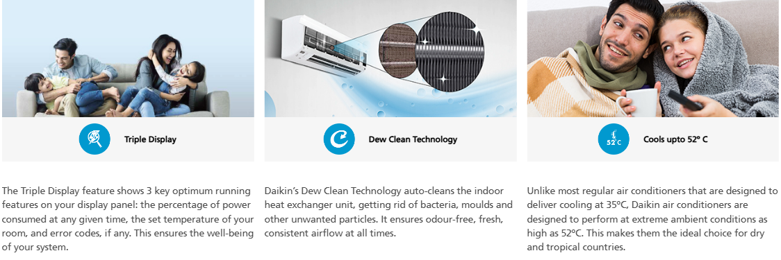 Equipped with Hepta Sensa technology (7 intelligent sensors), this AC continuously optimizes cooling performance, airflow, and energy usage. The DNNS Self Heal Coating and anti-corrosion treatment (BTA oil) protect the heat exchanger tubes for enhanced durability, while Dew Clean Technology automatically cleans the indoor coil to maintain hygiene. Features such as 16-meter air throw, 4-way swing, PM 2.5 filter, 3-stage air filtration, triple display, and a backlit remote with brightness control ensure superior comfort and convenience. Backed by 5 years warranty on PCB and 10 years on compressor, this Daikin AC offers dependable performance and peace of mind.
