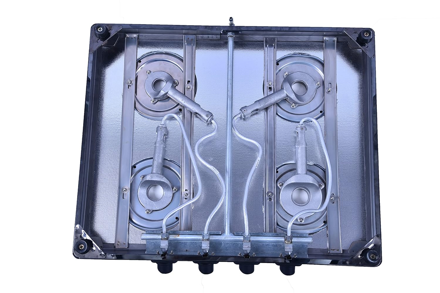 The 4-Burner Gas Stove is designed to offer efficient and versatile cooking for modern kitchens. Featuring a sleek black glass top, it adds a stylish and premium look while being easy to clean and maintain. Built with durable materials, this gas-powered stove ensures long-lasting performance and reliability for everyday cooking needs.