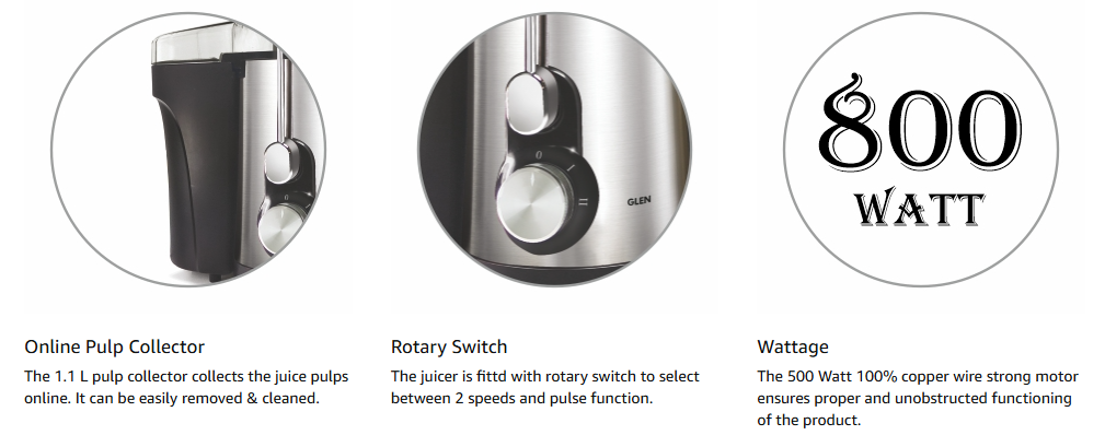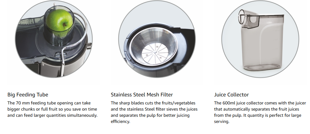 | Special Features | Anti-drip feature, Now Feed a whole apple, Powerful, copper motor of 600 W, Rating 30 minutes., Stainless steel finish |
