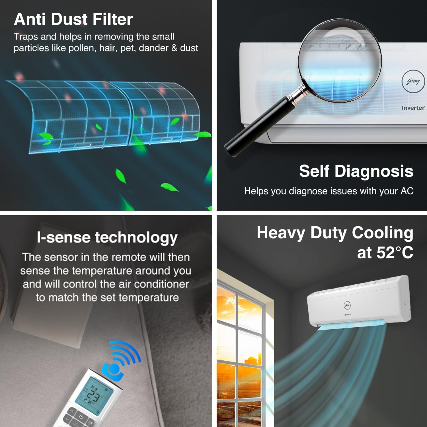 Stay cool even in extreme summers with the Godrej 1.4 Ton 3 Star Inverter Split AC (SIC 17TTC3 RYQ, 2025 Model). Designed for medium-sized rooms (111–150 sq. ft.), this AC delivers powerful airflow of 618 CFM and supports heavy-duty cooling up to 52°C ambient temperature. Its advanced inverter compressor automatically adjusts speed based on heat load, ensuring efficient and stable cooling performance.