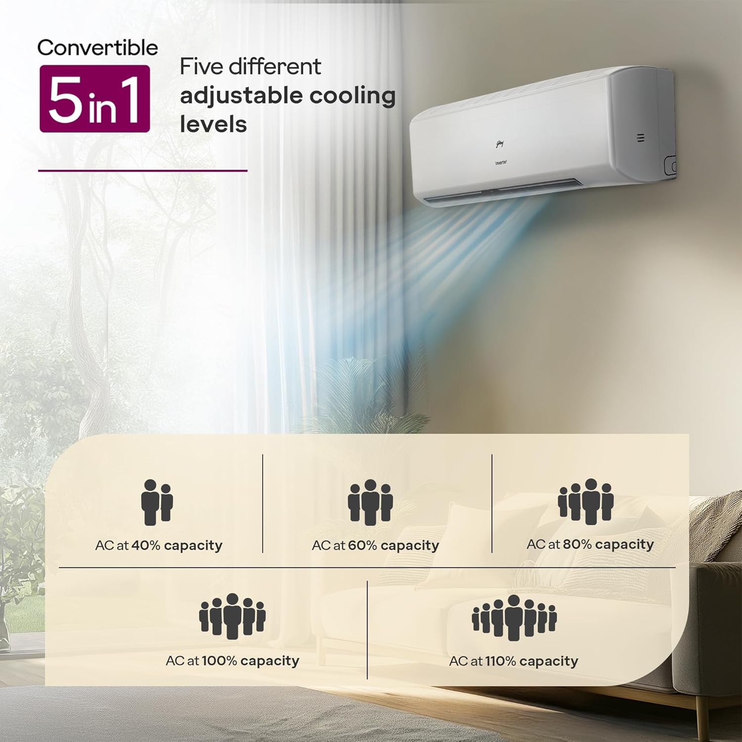 The AC 1.5T SIC 18ITC5-WYD Split 5S from Godrej & Boyce Mfg. Co. Ltd. is a 1.5-ton 5-Star inverter split AC designed for powerful yet efficient residential cooling. With 5-in-1 convertible capacity, it lets you adjust cooling output based on room load, helping reduce power use when full capacity isn’t needed. The rotary inverter compressor delivers stable temperatures, quieter operation (38 dB), and long-term durability, supported by a high SEER of 5.1.