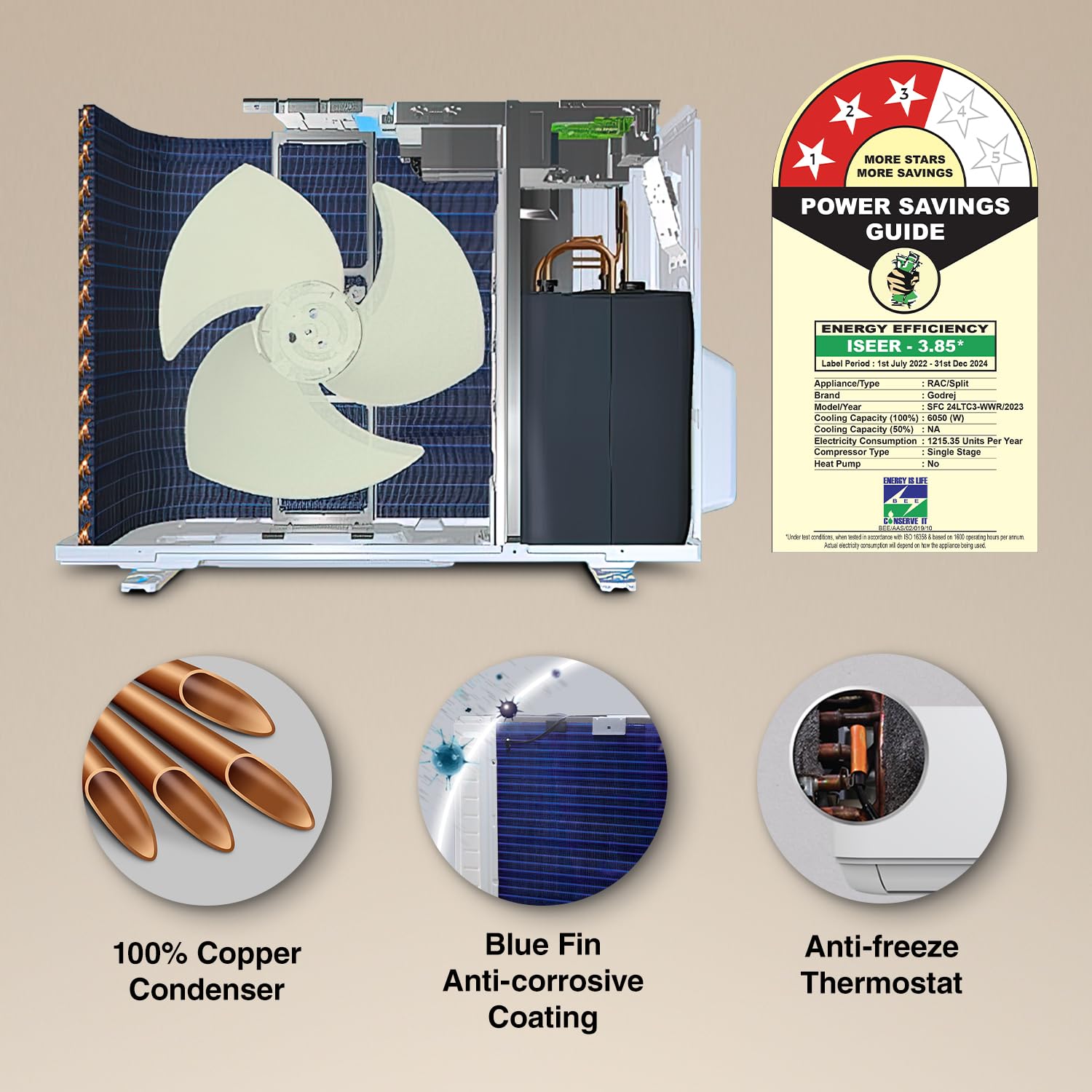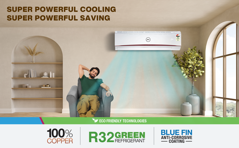 The SFC 24LTC3-WWR split air conditioner from Godrej & Boyce Mfg. Co. Ltd. is a 2-ton high-efficiency AC built for strong cooling performance in large rooms and living areas. Designed with R32 green refrigerant, it offers effective cooling with lower environmental impact. The system uses a copper condenser with anti-corrosive blue fins and a hydrophilic blue fin evaporator, improving heat exchange and long-term durability, especially in humid or coastal regions.