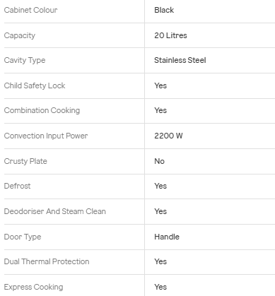 Equipped with a powerful 2200W convection input, this microwave ensures faster and even cooking results. The stainless steel cavity enhances durability and easy cleaning, while features like Combination Cooking, Express Cooking, and Defrost offer added convenience. With Child Safety Lock and Dual Thermal Protection, it ensures safe and worry-free operation.