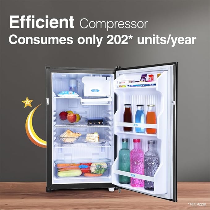 Inside, it features wire shelves, a jumbo vegetable tray, and large bottle storage to organize essentials efficiently. The quick ice-making capability adds convenience, while the automatic defrost system reduces maintenance effort. With an annual energy consumption of 202 kWh and a 1-Star BEE rating, it balances compact performance with everyday usability.