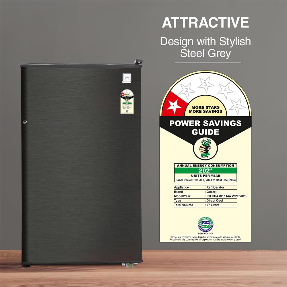 The RD CHAMP 114NA WPI FS ST single-door refrigerator from Godrej & Boyce Mfg. Co. Ltd. is a compact 97-litre direct cool fridge designed for small households, hostels, offices, or as a secondary refrigerator. Its steel finish, recessed handle, and space-saving design make it practical for tight spaces. Powered by a fixed-speed compressor with eco-friendly R-600A refrigerant, it delivers reliable cooling while keeping operation simple.