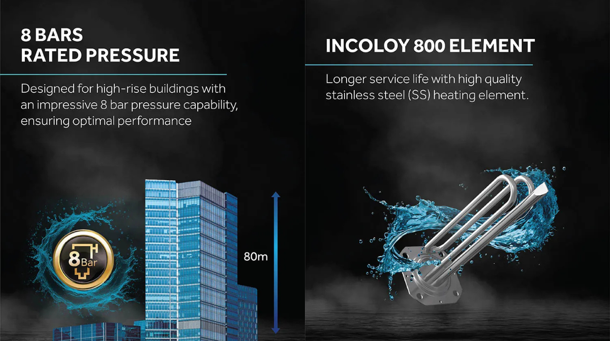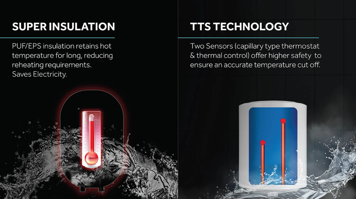 Equipped with advanced technologies like TTS Technology, UMC Tank, and an Incoloy 800 stainless steel heating element, this water heater offers superior durability and efficient heat retention. Safety is further enhanced with Shock Proof protection, ELCB, thermal cut-off, and a multi-function valve. User-friendly features such as a timer, automatic shut-off, and adjustable temperature control make it a reliable and convenient choice for modern households.
