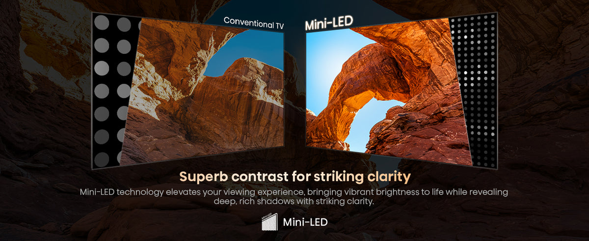 | Product Features | Mini-LED | Hi-View AI Engine Pro | 165Hz Game Mode Ultra | Built-in Subwoofer | VIDAA | 240 HRR, 288 HRR | Quantum Dot Colour (QLED Colour) | Dolby Vision IQ | AI Smooth Motion | AI Smooth Motion | Full Array Local Dimming | Built-in Subwoofer | Dolby Atmos | Filmmaker Mode | HDR 10+ Adaptive | Voice assistant via TV(Far Field) | Supported Apps : Netflix, Youtube, Prime Video, JioHotstar, SonyLiv, Zee5, SunNXT, Xstream Play, Apple TV, CrunchyRoll, TravelXP |