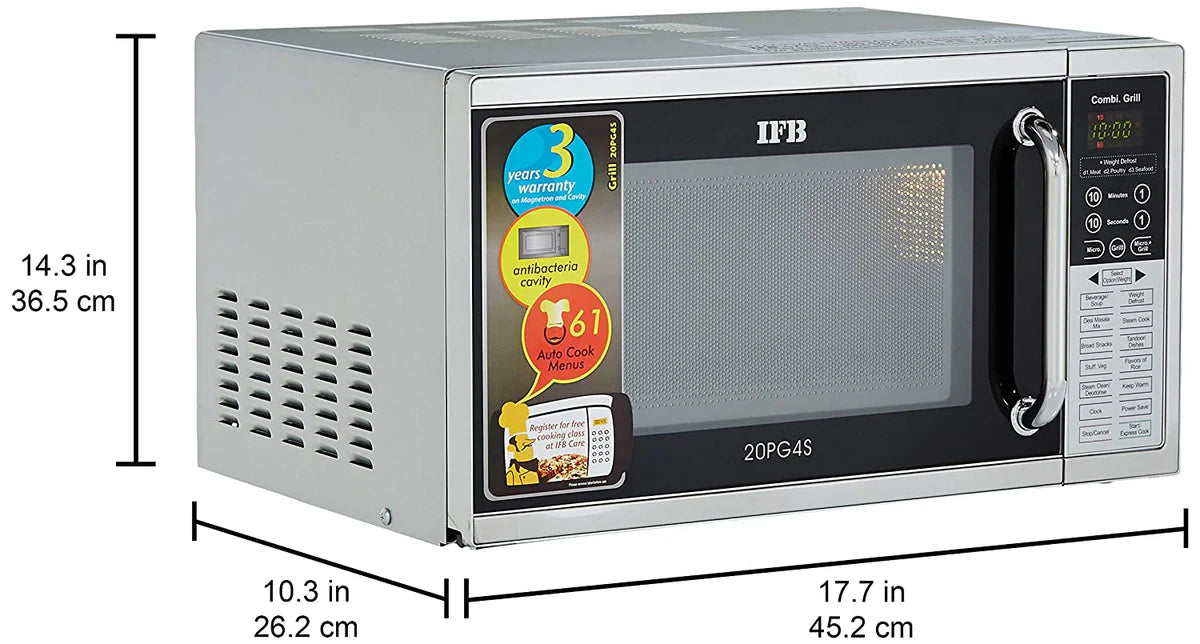 The IFB 20PG4S 20 L Grill Microwave Oven (Black/Silver) is designed for fast, flavourful, and convenient everyday cooking. With a powerful grill mode and microwave + grill combination cooking, it is ideal for grilling, reheating, defrosting, and preparing quick meals. The oven comes with 61 auto cook menus, making it easy to cook a wide variety of Indian and international dishes at the touch of a button.