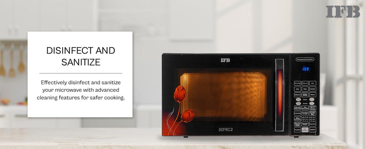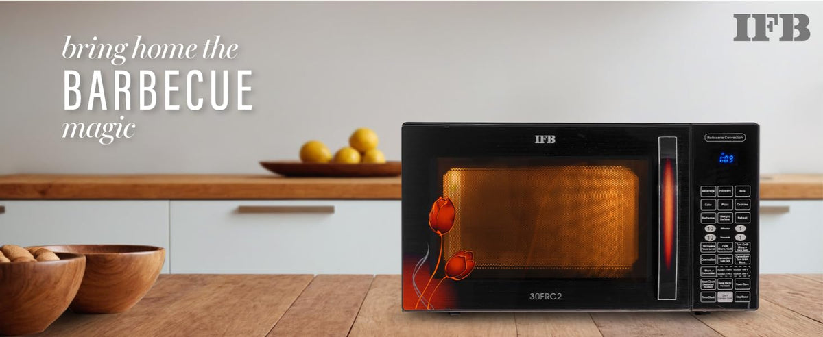 The IFB 30 L Convection Microwave Oven (30FRC2, Black with Floral Pattern) is designed for advanced cooking with style and performance. Featuring convection, grill, and microwave cooking along with a powerful rotisserie function, it lets you bake, roast, grill, reheat, and prepare restaurant-style dishes at home. The spacious 30-litre capacity is ideal for large families, while the elegant floral pattern design adds a premium touch to your kitchen décor.