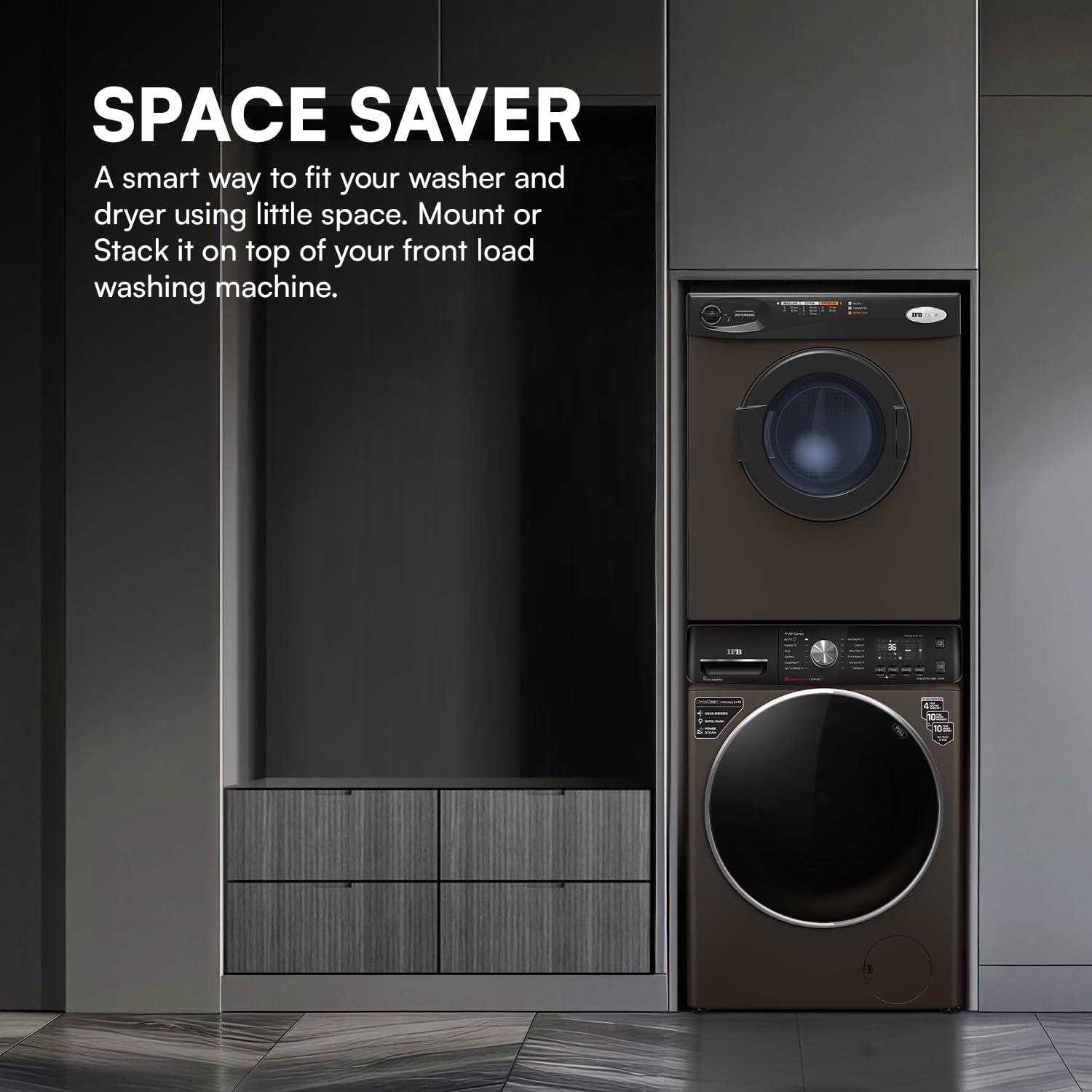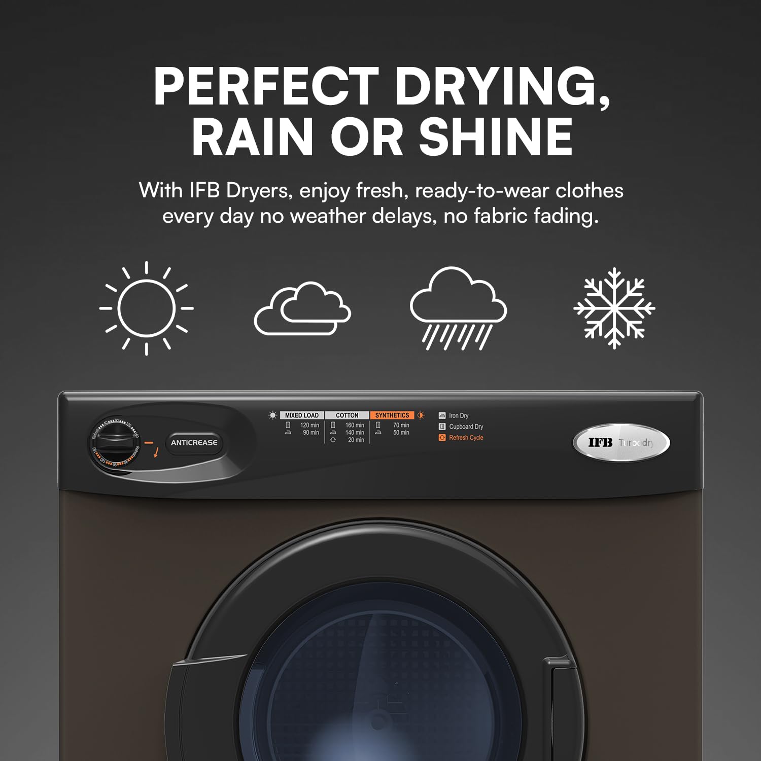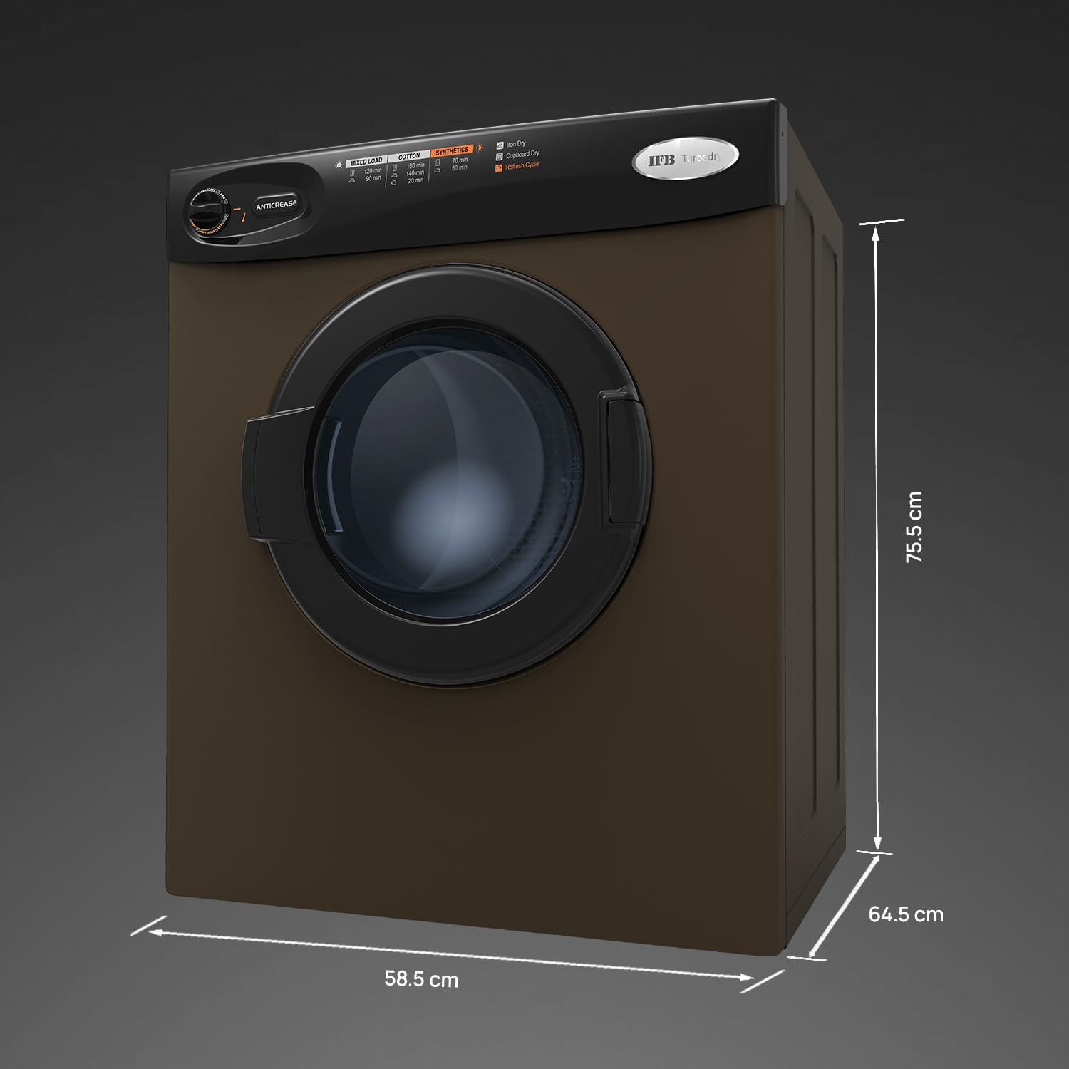 The IFB 5.5 Kg Front Load Clothes Dryer (Turbo Dry MX, Mocha) is designed to deliver 100% efficient drying with advanced hot air drying technology. Operating at 55 RPM, it ensures gentle yet thorough drying that protects fabric quality while removing moisture evenly. With a maximum cycle time of up to 180 minutes and a cool-down time of 13 minutes, this dryer provides optimal drying results without overheating clothes. The refresh cycle helps remove odours and freshen garments, making it ideal for daily and seasonal laundry needs.