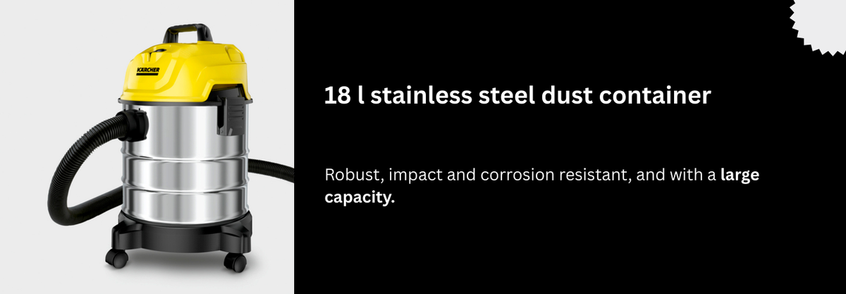 The Kärcher WD 1s Classic Wet & Dry Vacuum Cleaner is a compact yet powerful cleaning solution designed for everyday household cleaning needs. With an 18-litre container capacity and 1500W motor, it delivers strong suction power to effectively clean wet spills, dry dust, dirt, and debris from carpets, floors, and hard surfaces. Its classic yellow design reflects Kärcher’s professional-grade cleaning heritage.