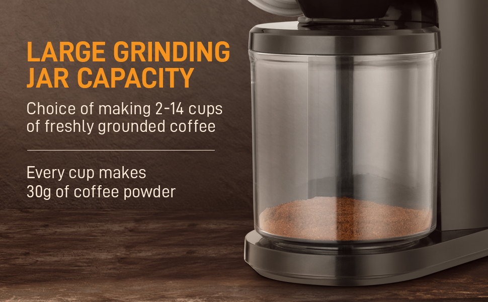 With 30 adjustable grind settings, this grinder allows you to choose the perfect texture — from coarse for French press to fine for espresso. The built-in quantity adjustment knob lets you grind beans for 2 to 14 cups, reducing waste and ensuring freshness every time. An anti-static design helps minimize mess, while the 150W motor running at 500 RPM ensures smooth and efficient grinding.