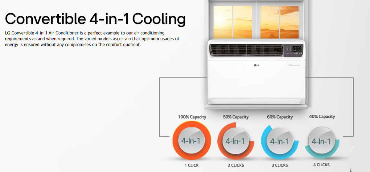 The LG UW-Q18WUZA 1.5 Ton Inverter Window AC combines powerful cooling with energy-efficient performance in a compact window design. Ideal for medium-sized rooms, it features an advanced Inverter Compressor that adjusts cooling output based on heat load, ensuring consistent comfort while reducing energy consumption. The Fast Cooling mode quickly brings down room temperature, making it perfect for hot summer days.