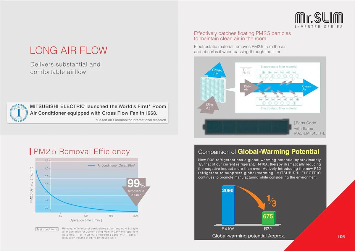 Built with Mitsubishi Electric’s trusted engineering, this model features a 100% copper condenser for superior heat transfer and long-term durability. The indoor unit offers high airflow up to 1053 CMH with whisper-quiet operation starting from just 28 dBA, making it ideal for bedrooms and living spaces. Compact indoor and outdoor unit designs ensure easy installation while maintaining a sleek, premium look.
