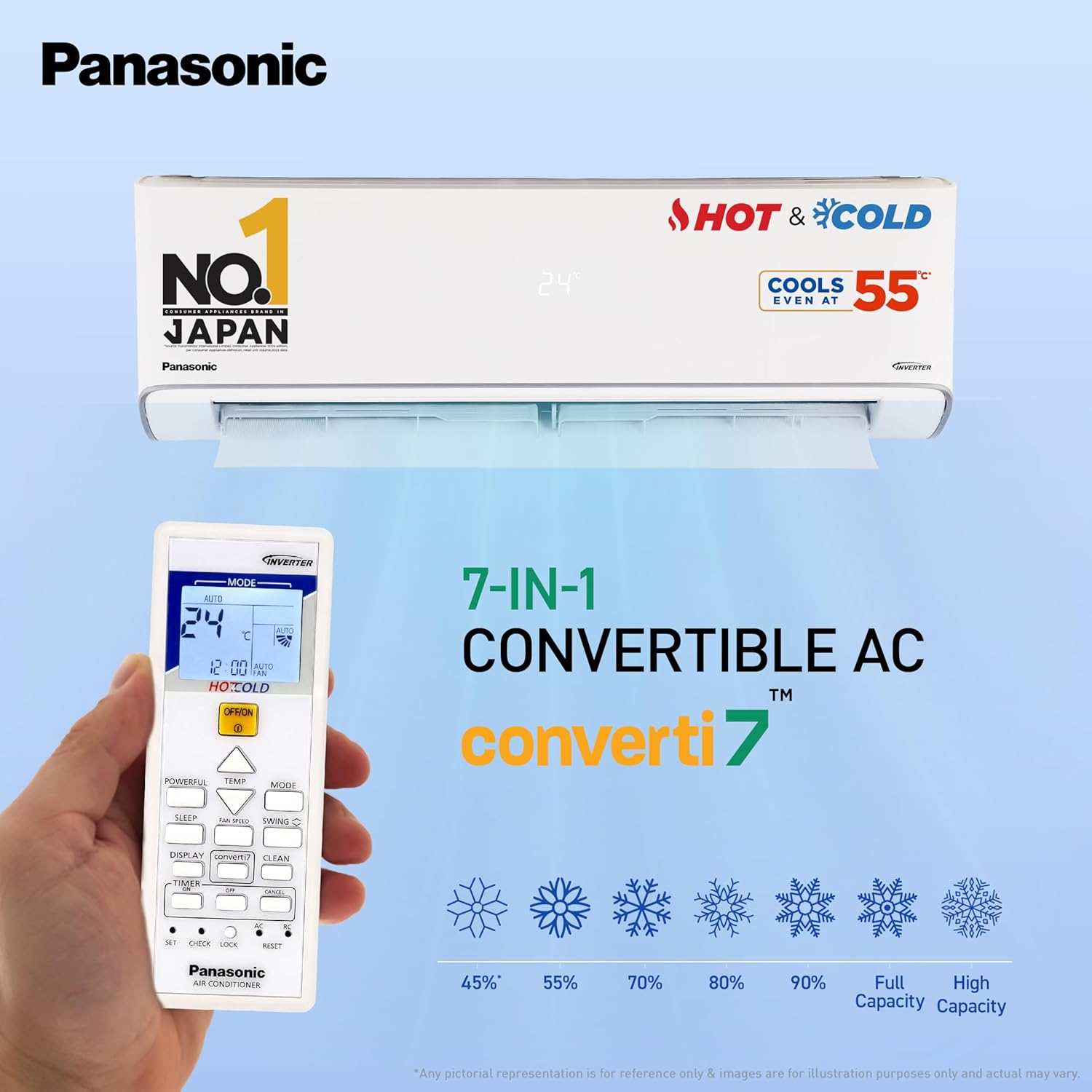 Enjoy year-round comfort with the Panasonic 1.5 Ton 3 Star Hot & Cold Inverter Split AC CS/CU-EZ18BKYF, designed to deliver efficient cooling in summer and reliable heating in winter. Powered by an advanced Inverter Compressor, this AC automatically adjusts cooling performance based on room conditions for better energy efficiency and consistent comfort. Its 7-in-1 Convertible Cooling allows you to customize cooling output from 45% to higher capacity modes, giving you flexible performance according to your needs.