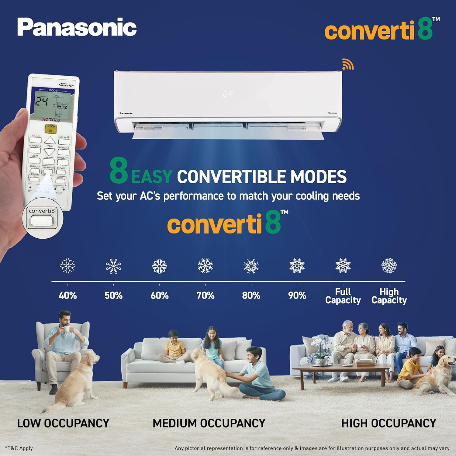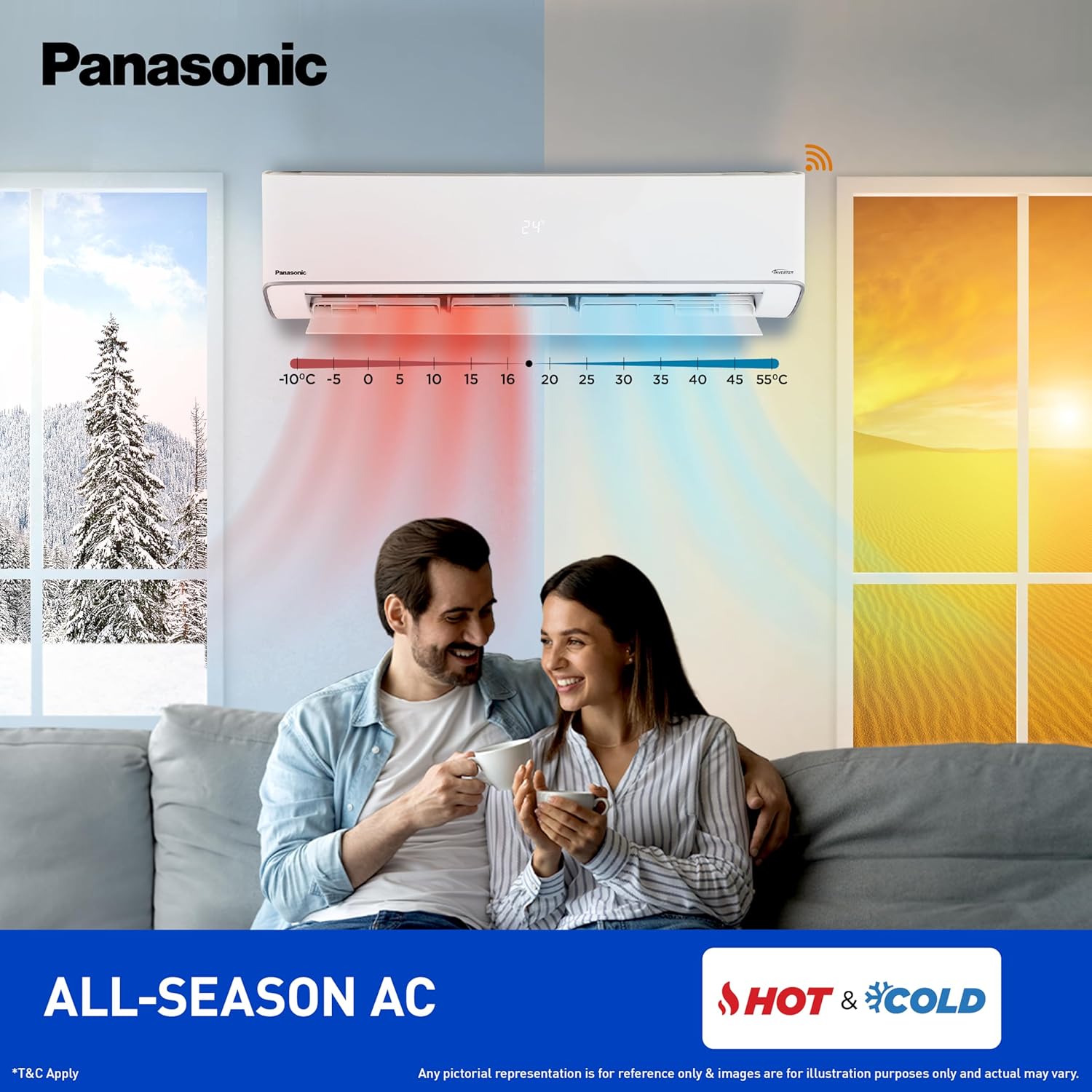 The Panasonic 1.5 Ton 3 Star Hot & Cold Wi-Fi Inverter Smart Split AC is a high-performance air conditioner designed for medium-sized rooms (about 120–170 sq ft). Thanks to its inverter compressor and 8-in-1 convertible cooling technology, it delivers efficient and customised cooling or heating based on your needs, helping you save power while maintaining comfort. This AC operates effectively across a very wide temperature range from -10 °C to 55 °C, so it works well in both hot summers and chilly winters. Its copper condenser and high airflow design ensure quick, consistent temperature control throughout your space.