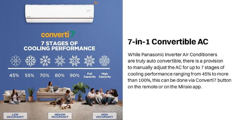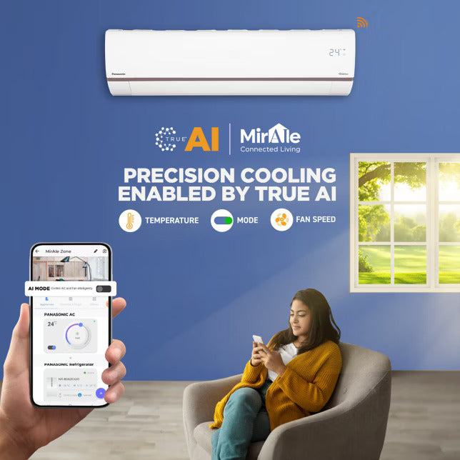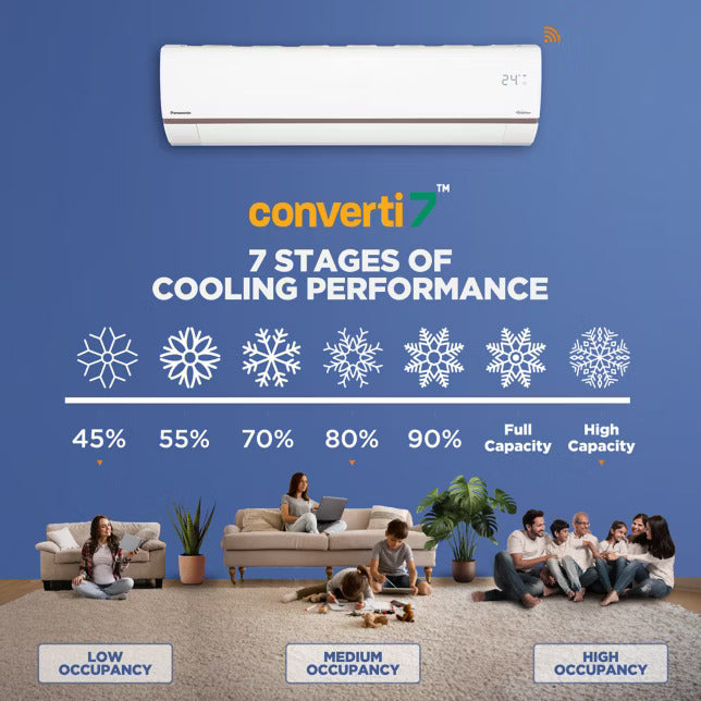 The Panasonic 1.5 Ton 3 Star Inverter Split AC is engineered to deliver powerful, intelligent, and energy-efficient cooling for medium-sized rooms. Equipped with True AI powered Smart Cooling, the AC automatically senses temperature, humidity, and external weather conditions to optimize cooling performance while minimizing power consumption. Its 7-in-1 Convertible technology gives you complete control over cooling capacity, allowing manual adjustment from 45% to over 100% as per your comfort needs.