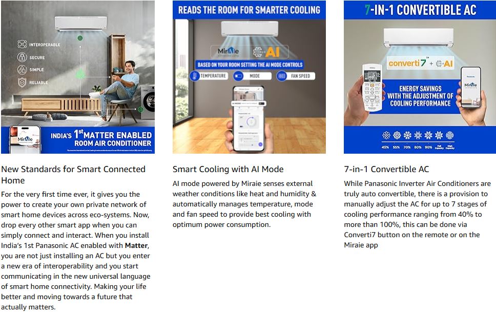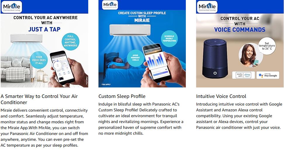 This AC is also a Smart Wi-Fi enabled model, allowing you to control temperature, modes, and schedules directly from the Miraie App, along with hands-free voice control using Alexa and Google Assistant. The PM 0.1 air purification filter ensures healthier indoor air by trapping ultra-fine dust and pollutants, while the 100% copper condenser provides faster cooling and long-lasting durability.