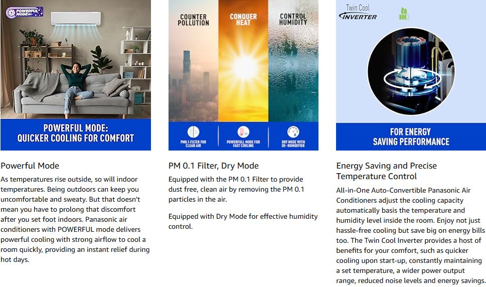 The Panasonic 1 Ton Smart Inverter Split Air Conditioner is designed for efficient cooling in small rooms (up to 120 sq. ft.) while delivering intelligent performance and energy savings. Equipped with 7-in-1 Convertible Modes with True AI (Converti7), the AC automatically detects room temperature and usage patterns to adjust cooling capacity and fan speed for optimum comfort. You can also manually select cooling levels from 40% to 90%, Full Capacity, or High Capacity as per your needs.
