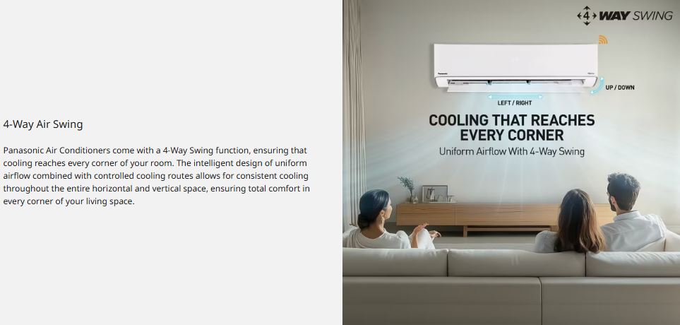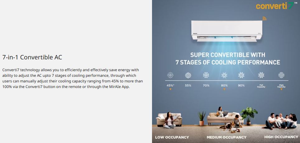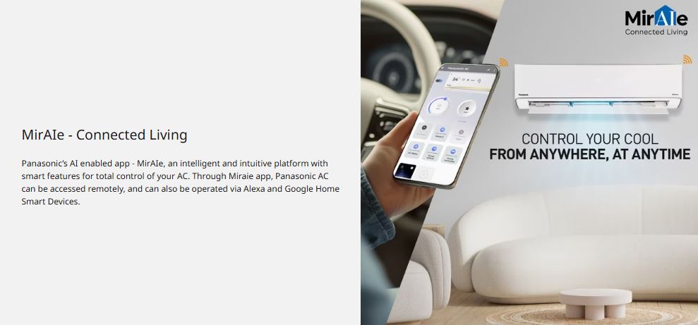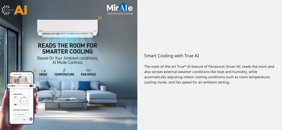 The Panasonic 2 Ton 5 Star Wi-Fi Inverter Split AC is engineered for powerful, intelligent, and energy-efficient cooling. Featuring 7-in-1 Convertible Cooling with True AI, it automatically senses room conditions and optimises cooling capacity for superior comfort and lower power consumption. With a high SEER of 5.2 and 5-Star energy rating, this AC ensures excellent performance while keeping electricity bills under control.