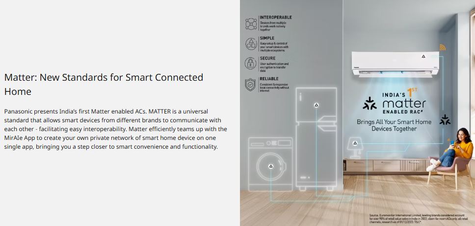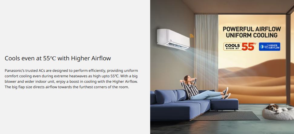 Designed for modern smart homes, this AC is India’s 1st Matter-enabled RAC, supporting seamless control via smartphone and voice assistants like Alexa and Google Home. The PM 0.1 air purification filter removes ultra-fine dust and pollutants for healthier indoor air, while the 100% copper condenser with R32 refrigerant delivers faster cooling, better durability, and eco-friendly operation. With 720 CFM high airflow and 4-way swing, it cools large rooms evenly even in temperatures up to 55°C.