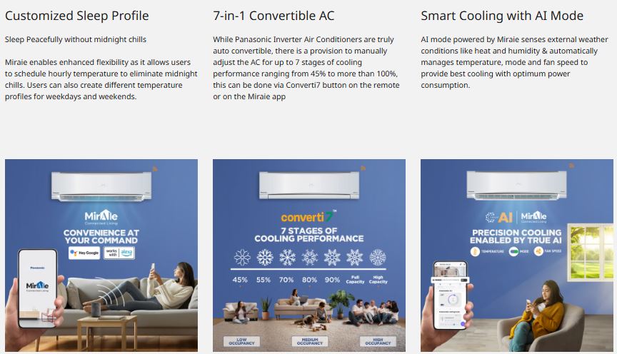 This AC also focuses on smart living and healthy air quality. Equipped with a PM 0.1 air purification filter, it removes ultra-fine dust particles to provide cleaner and safer indoor air. The Wi-Fi enabled Smart AC can be controlled effortlessly via the Miraie Mobile App, as well as through voice commands using Alexa and Google Assistant. Built with a 100% copper condenser coil and eco-friendly R32 refrigerant, it ensures long-lasting performance, efficient heat exchange, and low maintenance—making it a reliable choice for modern homes.